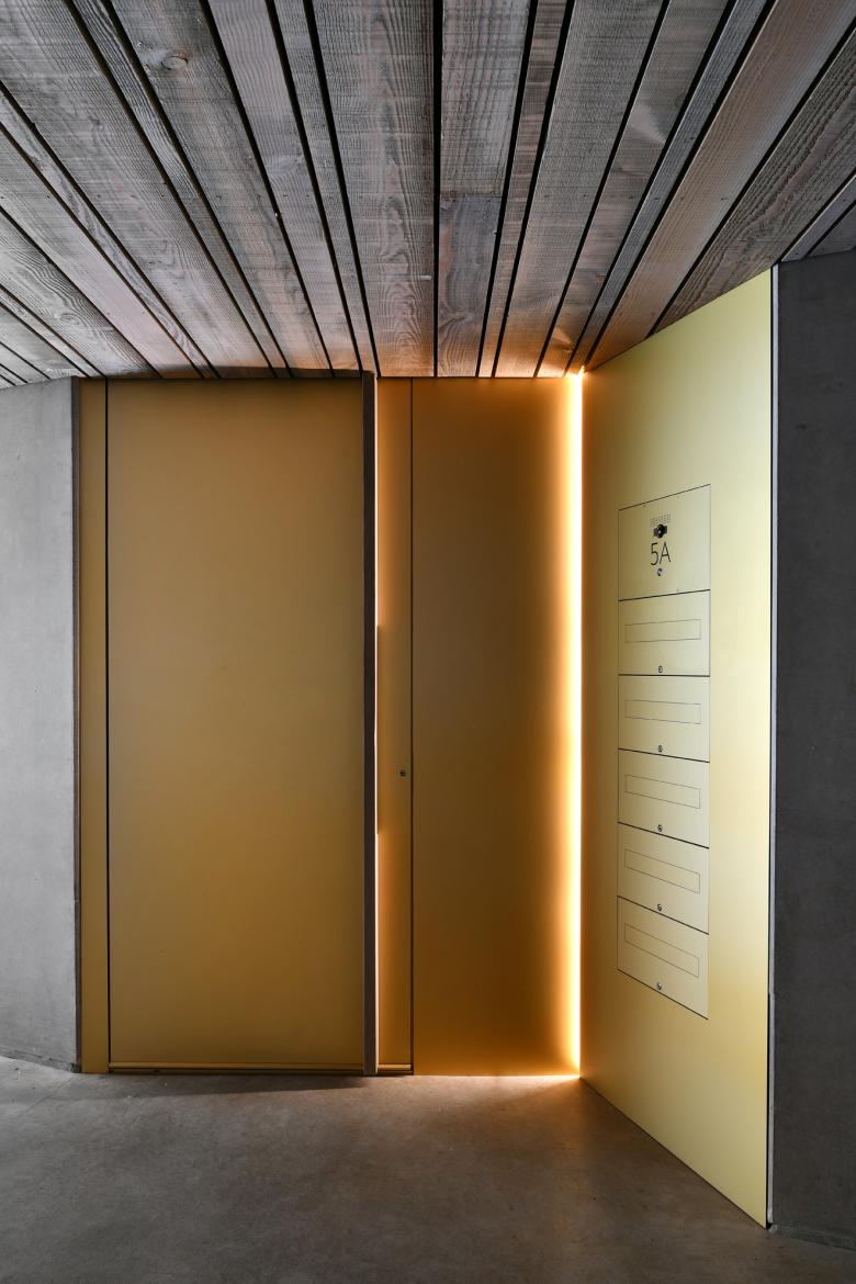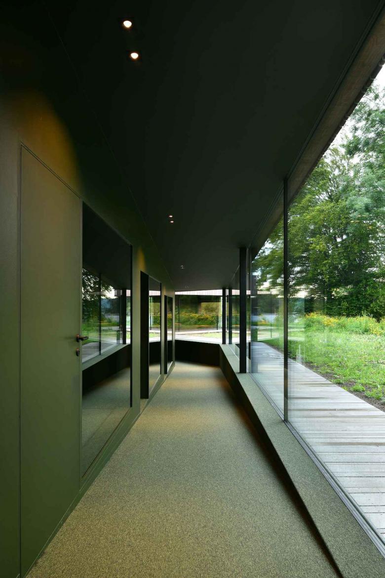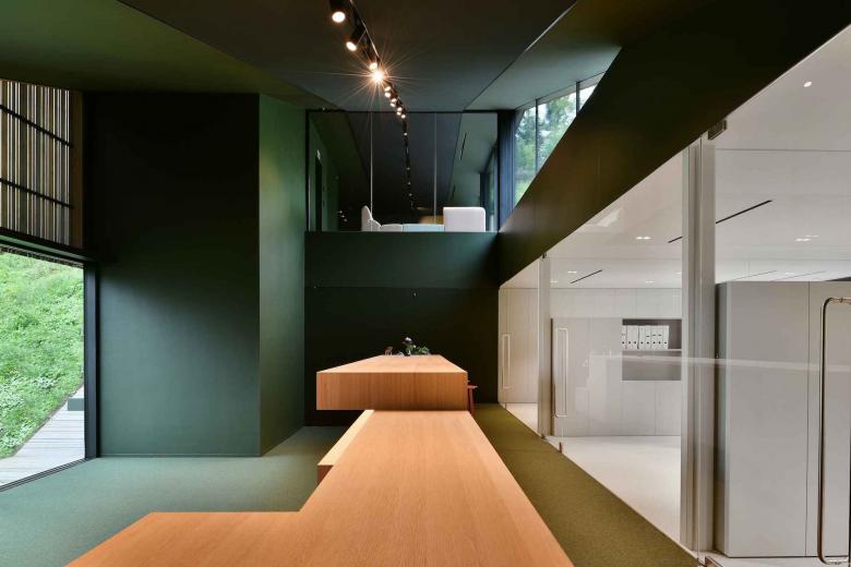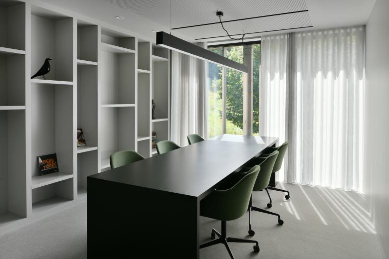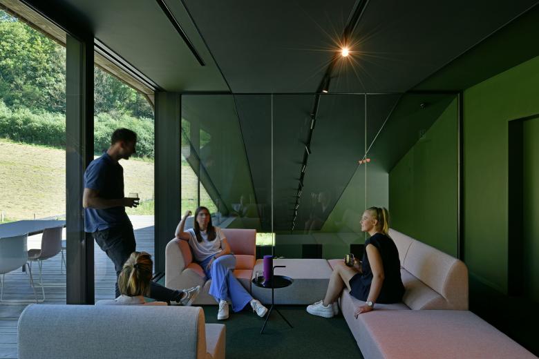 Au sein du bâtiment, les espaces intérieurs évoluent progressivement des zones d'accueil et de réunion vers les zones de travail. Un espace dédié aux réunions d'équipe, pauses, temps libres et activités complémentaires surplombe le plateau des bureaux et s'ouvre totalement sur la colline. Ce cheminement "vert sapin", physique et visuel, en contact permanent avec la nature, distribue de manière progressive et naturelle les espaces adaptés aux différentes fonctions. Au cœur du projet, un espace polyvalent en connexion avec l'environnement extérieur et les espaces de travail favorise les interactions et suscite les échanges.