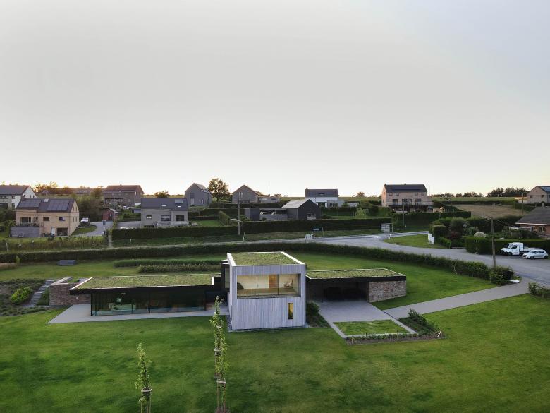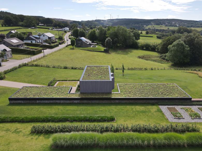 La volumétrie à toitures plates entièrement végétalisées préserve la très belle vue sur la vallée à 180° pour les habitations situées en contre-haut, de l’autre côté de la voirie principale.