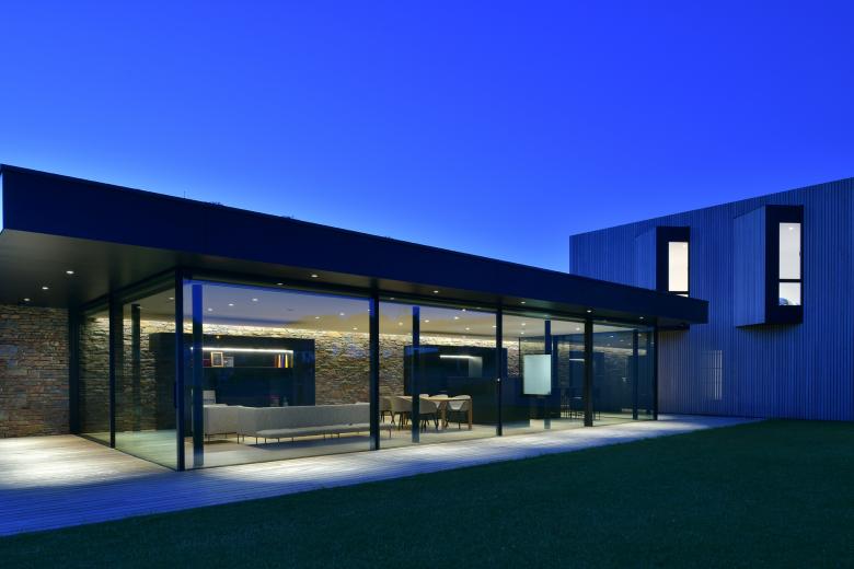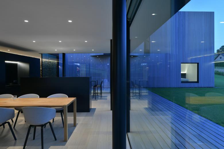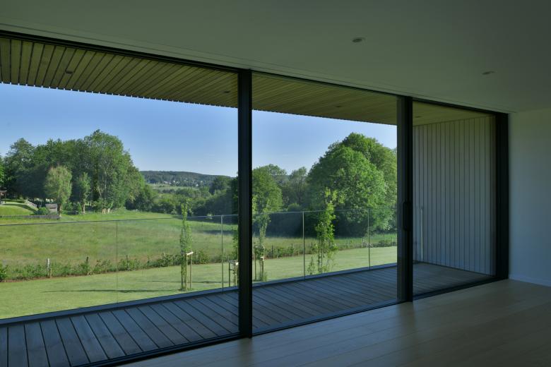 Les deux paliers du terrain et le positionnement du volume en bois créent l’intimité des espaces généreusement vitrés.