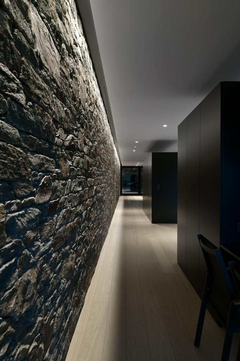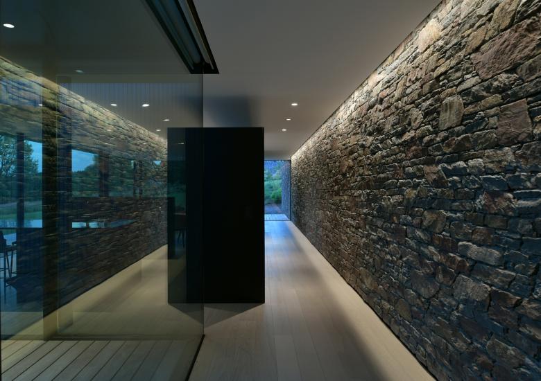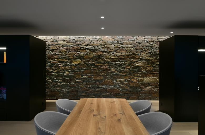 La continuité intérieure du mur en pierre accentue l’appartenance du séjour au jardin.