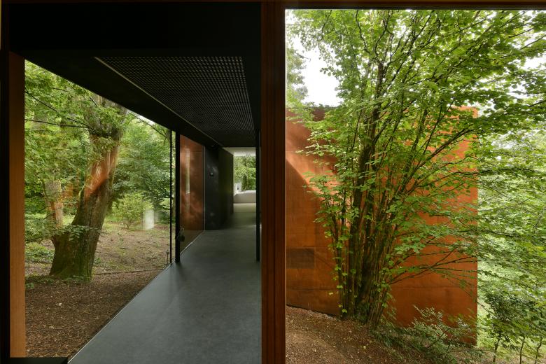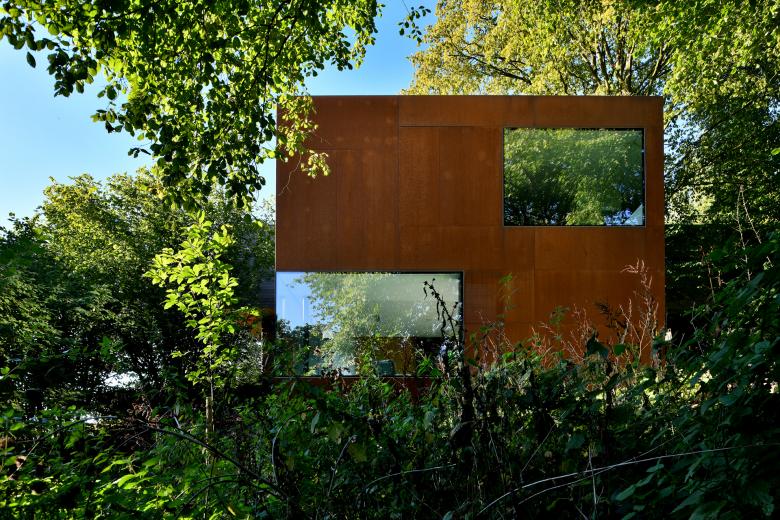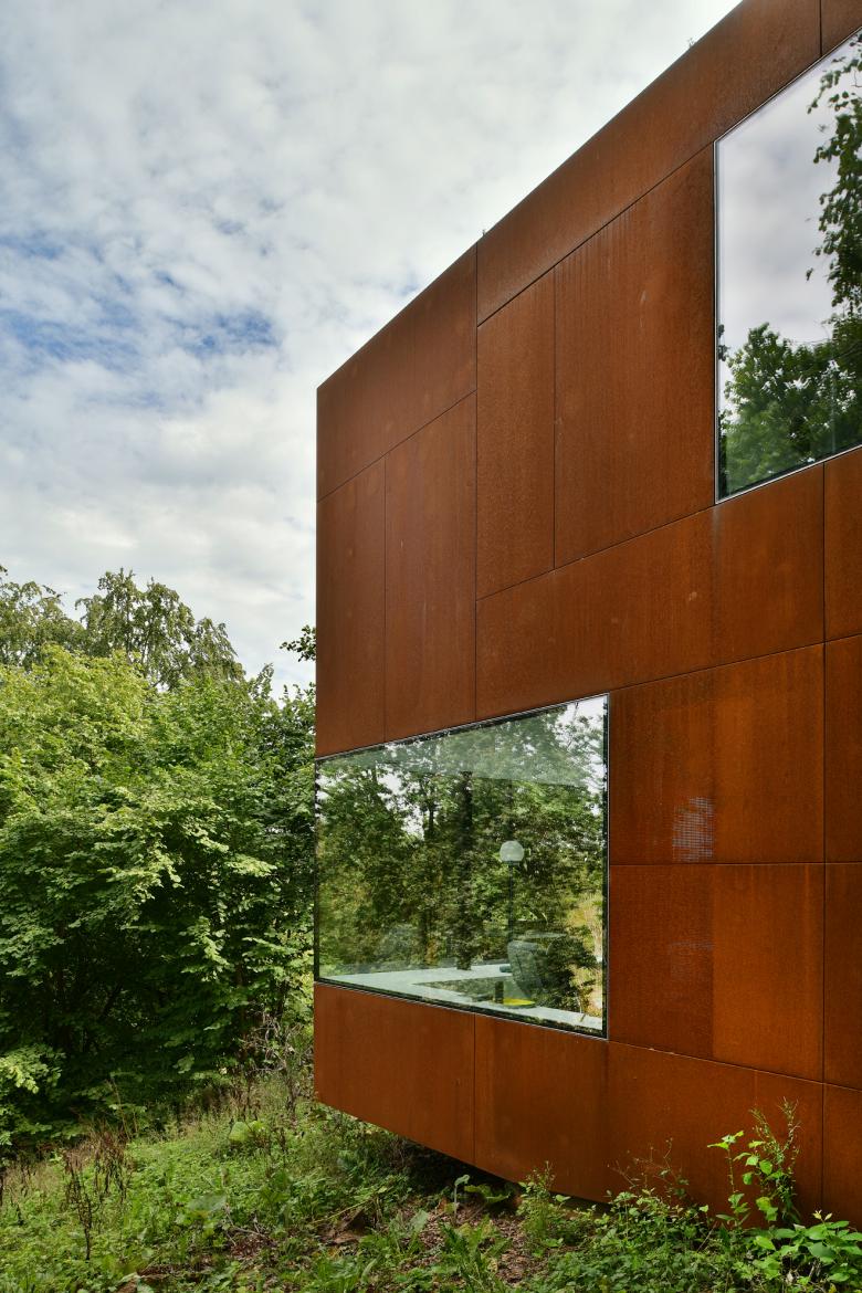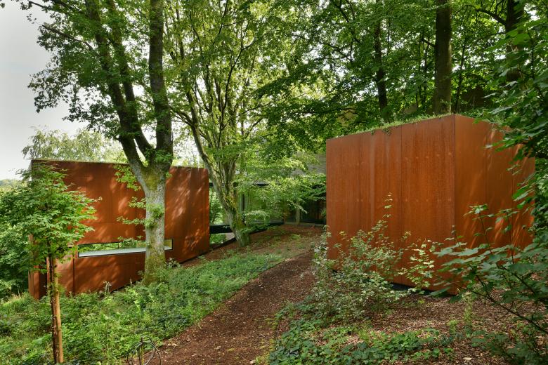 Volumétriquement, ce cube de 7 m de côté est recouvert d’acier Corten en élévations et de végétation en toiture, il dialogue ainsi parfaitement chromatiquement avec la forêt et la pierre de recouvrement de l’habitation existante.