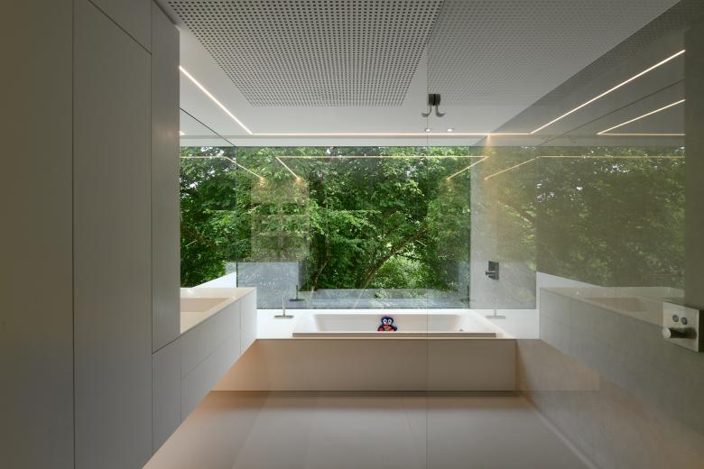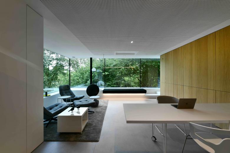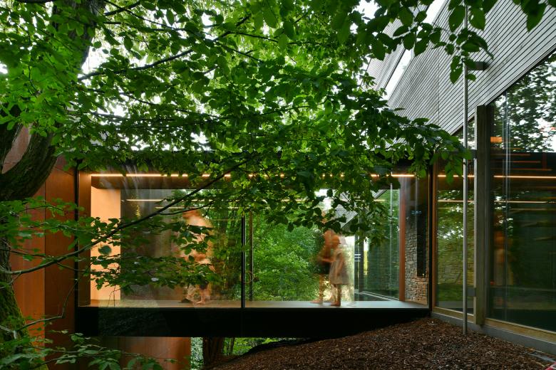 Une passerelle en verre permet de liaisonner les deux entités de manière légère et transparente.