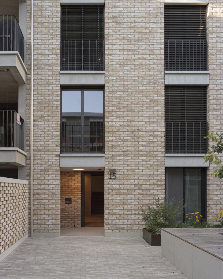 Das äussere Erscheinungsbild ist geprägt von einem Sichtbetonsockel, einem zweischaligen, hochwertigen Sichtmauerwerk aus Klinkersteinen und im Dachgeschoss von hinterlüfteten Aussenwandverkleidung, sowie von grosszügigen, geschosshohen Fenstereinsätzen aus Holz/Metall und massiven Kunststeinelementen. Der hofübergreifende Einsatz dieser Elemente schafft einen vielfältig stimmigen Gesamteindruck.