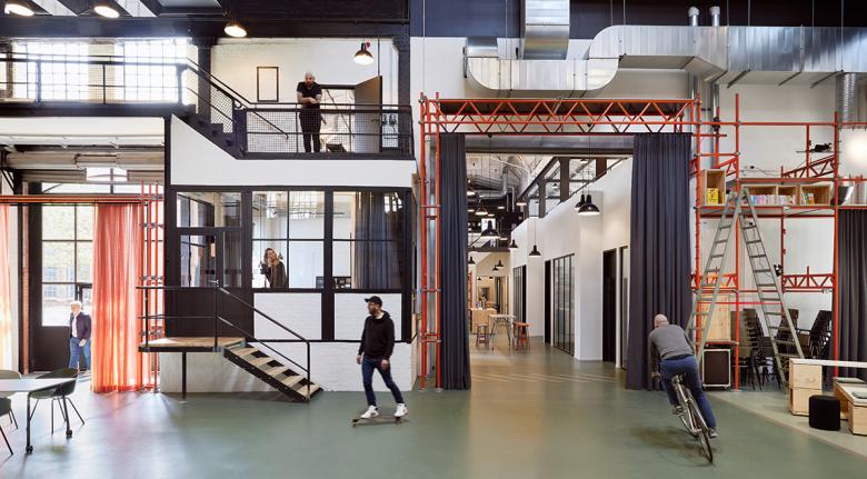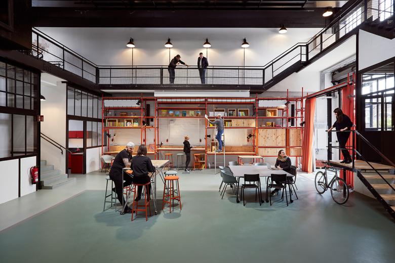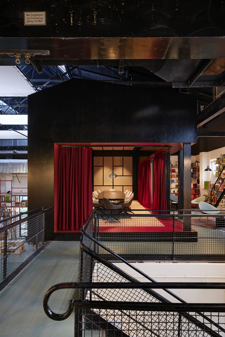 Als Besonderheit und in Anlehnung an die frühere Nutzungsatmosphäre umfassen raumhohe rote, nach oben auslaufende Baugerüste auf drei Seiten den Eventspace. Sie dienen für unterschiedliche Bespielungen und wirken zudem als Eyecatcher im Raum. So nehmen sie Tischlermöbel wie Sitzbänke und temporäre Arbeitsflächen auf, sind Stauraum für die lose Möblierung, integrieren die Bibliothek, das Techniklager sowie die Medien- und Raumlufttechnik, lassen sich bei Bedarf umbauen für Cateringsituationen oder Buchpräsentationen und bieten Möglichkeiten zum Aufhängen und Hinterleuchten von bedruckten Planen für verschiedene Veranstaltungsformate.