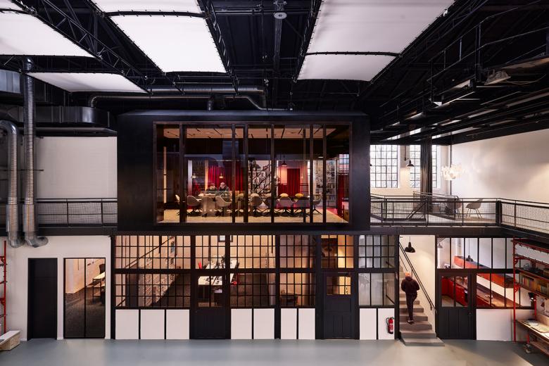 Im Obergeschoss der kleinen Halle entstanden feste Galeriearbeitsplätze, ein kleiner Open Space für das Presse- und Marketingteam, ein großer Meetingraum sowie ein Bibliotheksbereich mit Loungecharakter. Der verglaste Meetingraum ragt mit seiner Bodenkante in den offenen raumhohen Eventspace hinein und bietet Platz für bis zu 16 Personen. Über den umlaufenden Erschließungsgang ergeben sich Blickbeziehungen ins Erdgeschoss.