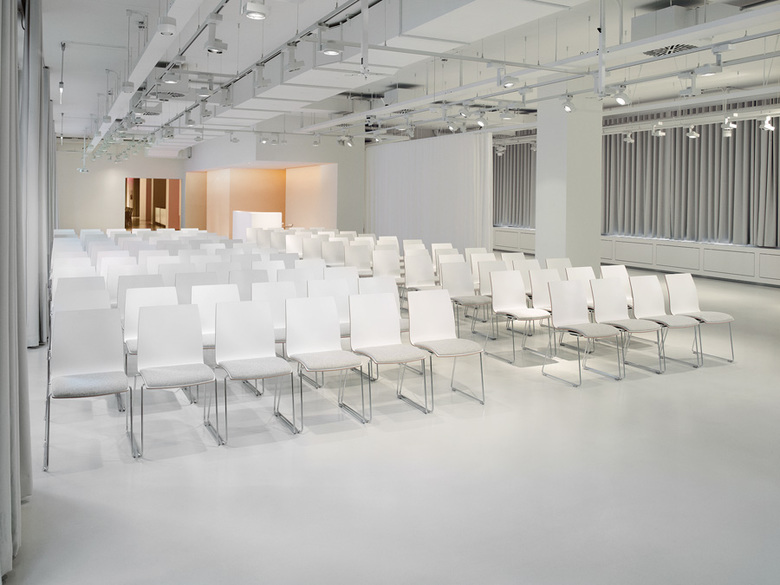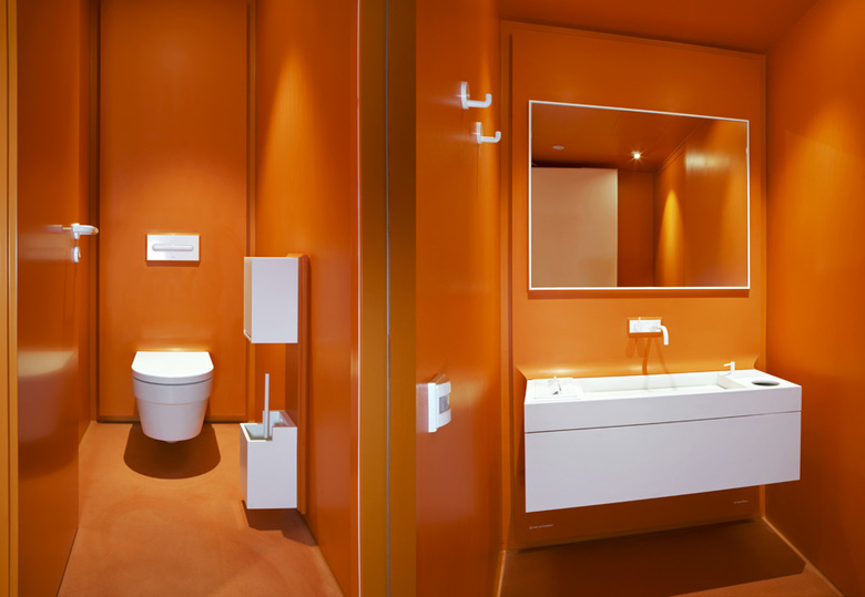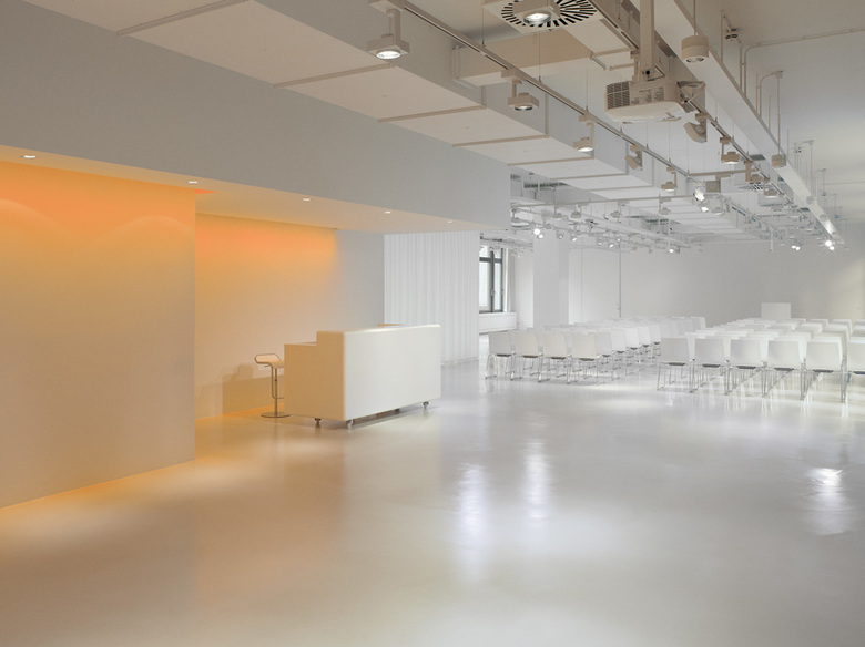 Das Studio ist als White Cube konzipiert, dessen Ambiente mit wenigen Eingriffen leicht allen möglichen Anforderungen entstprechend verändert werden kann. Ein mobiler Empfangstresen lässt sich ebenfalls flexibel in jede erdenkliche Raumkonstellation integrieren. Der Sanitärbereich, innen komplett in einem kräftigen Orange und mit weissen Sanitärobjekten, bildet einen überraschenden Kontrast zum neutralen Weiß des Studios.