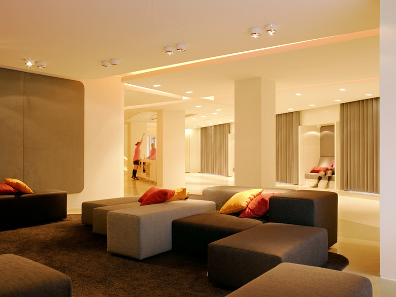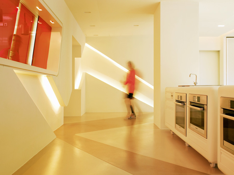 Im Gegensatz zum nüchternen Ambiente des Studios bietet der Salon eine eher behagliche Atmosphäre. Hier befindet sich neben einer Sofalandschaft auch eine voll ausgestattete Küche und Platz für eine Speisetafel sowie zwei mobile Kochblöcke, die von privateren Empfängen und Dinners bis hin zum Schaukochen jede Art von Event ermöglichen. Lichtvouten laufen über Wände und Decken und leuchten in fast jeder erdenklichen Farbe. Sie sorgen so durch ihre indirekte Beleuchtung für die jeweils gewünschte Atmosphäre und erzeugen eine fließende Verbindung zwischen dem Lounge- und dem Essbereich. Ein weiteres Detail sind die Sitzkojen, die sich hinter raumhohen Holzelementen an der Fassadenseite verbergen.