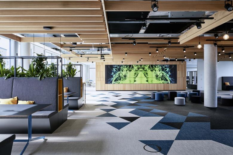 Die multifunktionale Fläche ist mit Tischgruppen, Diner-Bänken und flexiblen Stehtischen ausgestattet und bietet damit unterschiedliche Aufenthaltsqualitäten. In einer großen Medienwand sind ausziehbare Podestelemente integriert, um bei Bedarf eine Podiumssituation herzustellen.