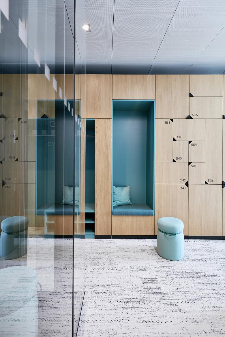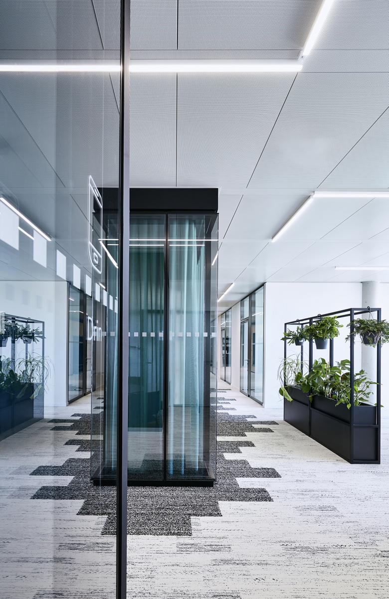 Die Arbeitsplatzbereiche sind auf allen Geschossen zur tageslichtdurchfluteten Fassade hin positioniert. Sie umschließen den Kern mit einer schwarz gestalteten Kommunikationszone mit buchbaren Meetingräumen und einem maßgefertigtem Funktionsmöbel in warmer Holzoptik, das Rückzugs- und Garderobennischen, Locker, Serviceräume und Copyzonen beherbergt.