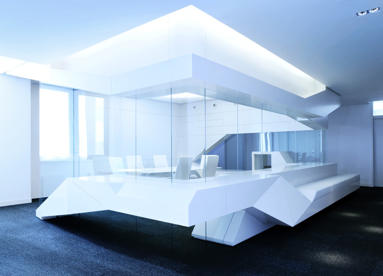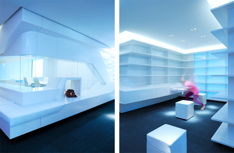 Das Raummöbel erzeugt auf diese Weise drei Bereiche mit unterschiedlichen Qualitäten: Einen gänzlich vom Objekt umschlossenen Bemusterungsraum mit offiziellem Charakter, ganz in weiss gehalten und mit einer Lichtdecke ausgestattet; Ein Archiv mit temporärem Arbeitsplatz für die Auswahl von Objekt- und Materialmustern, sowie einen natürlich belichteten, informellen Besprechungsraum.