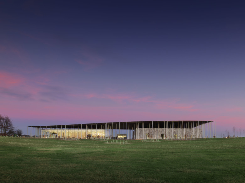 Supported by slender angled stick columns, a non-reflective metal roof shelters various visitor amenities. Its edges are perforated to dapple the light reaching the exhibition and education facilities housed below in a pair of single-storey cubes, one glass and the other timber.