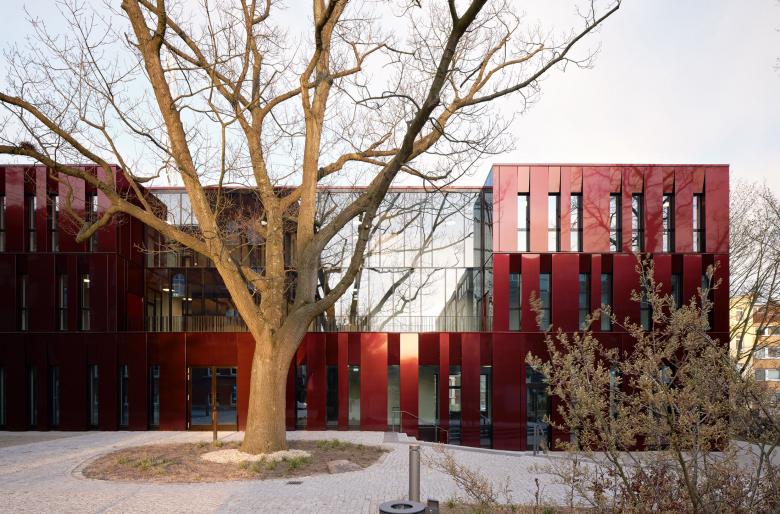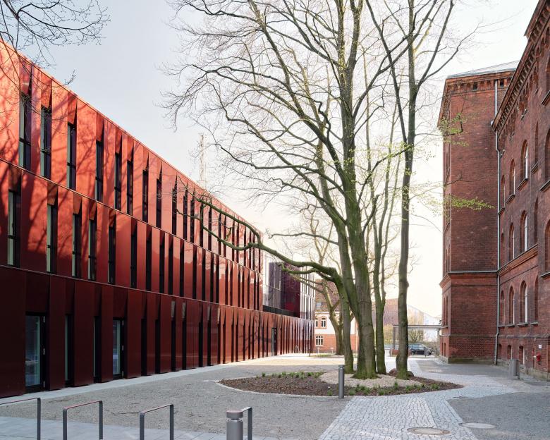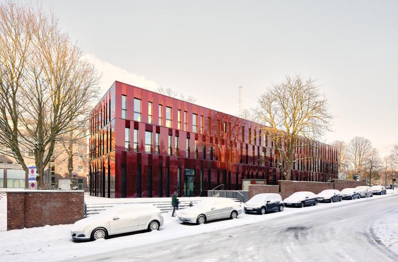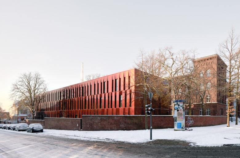 Auf dem Universitätscampus der TU Hamburg-Harburg entsteht das Zentrum für Studium und Promotion. Mit dem Neubau wird auf den gestiegenen Flächenbedarf der TU Hamburg reagiert und neue Lehr- und Lernräume für Studierende und Professoren geschaffen. Die Kubatur des dreigeschossigen Baukörpers fügt sich in die vorhandene Topografie ein und führt den Niveauunterschied im Gebäude fort. Im Erdgeschoss gliedert sich das Gebäude in den durch eine Treppe erreichbaren Promotionsprüfungs- und Seminarbereich sowie den tiefer gelegenen, öffentlichen Bereich mit Foyer und Café. Durch die besonders hohen Räume in der unteren Ebene wirkt das Café hell und einladend. In den oberen Geschossen befinden sich die Arbeitsbereiche für Studierende, ein Seminarraum, Probe- und Kunstraum sowie Büro- und Technikflächen. Die Integration mobiler Trennwände sorgt für flexible Raumnutzungen. Der zwei Meter tiefe Einschnitt im Westen des Gebäudes ist ab dem ersten Obergeschoss eine Reaktion auf den mit Bestandsschutz belegten Baumbestand und bietet den Studierenden einen großzügigen Außenbereich. Das begrünte Flachdach dient der TUHH als Forschungsfläche für das Institut für Wasserbau, das die Regenwasserretentionsfähigkeit unterschiedlicher Gründachaufbauten untersucht. Die spielerische Anordnung von raumhohen Verglasungselementen und geschlossenen Fassadenflächen erzielt ein vertikal ausgerichtetes, klaviaturartiges Erscheinungsbild. Die geschlossenen Flächen bestehen aus unterschiedlich breiten Metallpaneelen, die je nach Tageszeit und Sonnenstand ihr Erscheinungsbild ändern. Das Material hebt sich bewusst von den bestehenden Backsteingebäuden ab, orientiert sich jedoch farblich an der durch Backstein geprägten Umgebung und schafft so ein harmonisches Gesamtensemble.