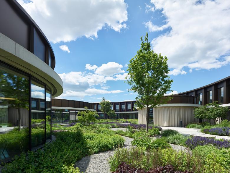 The enclosed design of the courtyard of the large office ring protects against noise and creates a self-contained inner world.