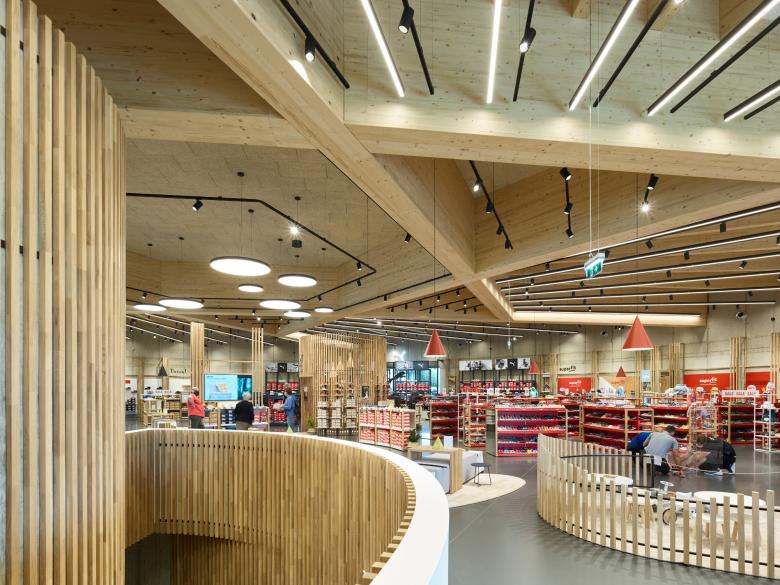 The shape and design of the circular shoe outlet creates a very special shopping experience. The column-free space is spanned by a star-shaped wooden supporting structure. This ring building can also be flexibly redesigned – according to equirements and development.