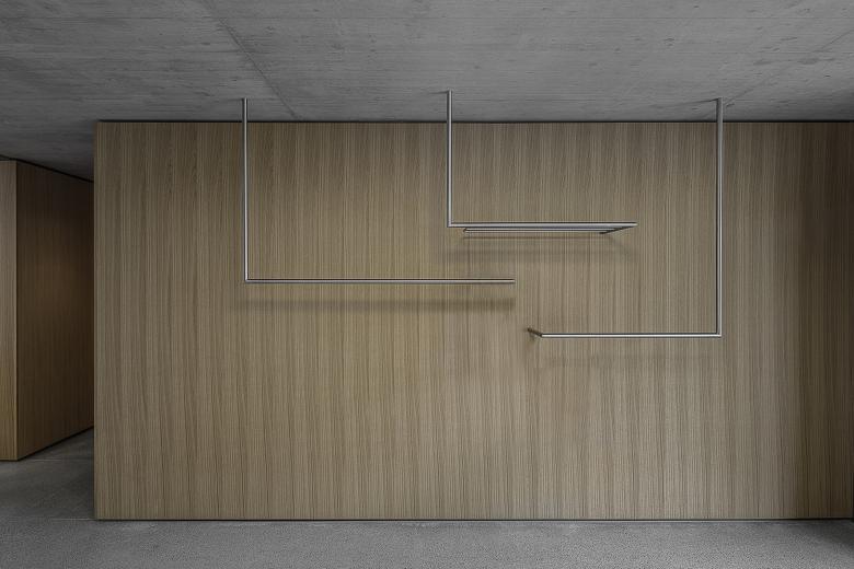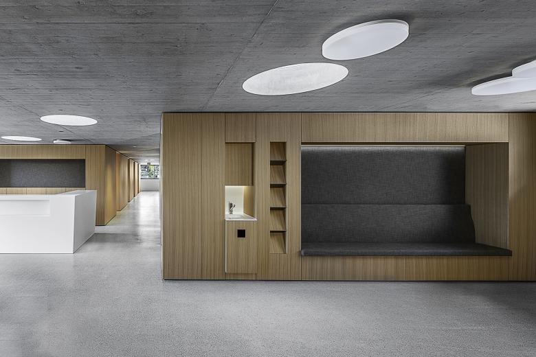 Im Sockelgeschoss wird die Arztpraxis untergebracht, welche strassenseitig zugänglich ist. Der grosse Innenraum wird mit Zwischenräumen in verschiedene Nutzungsbereiche unterteilt. Der offene Empfangs- und Warteraum gliedert die Innenräume in eine öffentliche und halböffentliche Zone. Dieser Zwischenraum dient als Orientierung und ermöglicht dem Sockelgeschoss eine angenehme natürliche Belichtung. Die einzelnen Räume werden durch Eingangsnischen rhythmisiert. Die Materialfarben und -oberflächen von Sichtbeton, Eichenholz und Terrazzoboden prägen die Stimmung des Innenraumes.