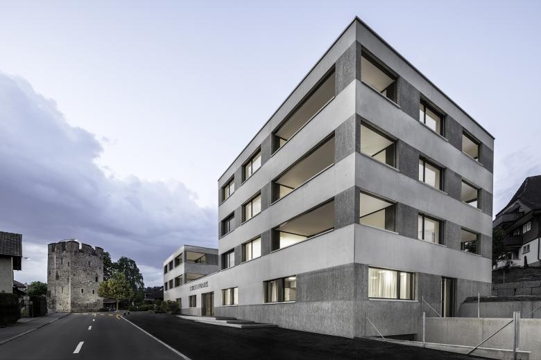 Die Ortsbezeichnung Friedau umfasst die Nahe Umgebung vom Hexenturm, dem mittelalterlichen Eingangstor der Luzerner Kleinstadt Sempach. Die Bauparzelle verlangt eine sensible Reaktion in Bezug auf die Volumetrie. Um dem gerecht zu werden, wird die Bauvolume in mehrere Teile gegliedert. Über das solide eingeschossige Fundament werden zwei unterschiedlich hohe Wohnblöcke gesetzt. Die dreigeschossige Volumetrie auf der Südseite übernimmt die Höhe des Nachbargebäudes. Nordseitig hält sich die zweigeschossige Volume angenehm zurück. Der geschichtsträchige schlanke Hexenturm wird somit respektiert und im Ausdruck nicht konkurriert. Die ruhig strukturierte eingefärbte Sichtbetonfassade übernimmt den muralen Charakter der Nachbargebäude, ohne die Eigenständigkeit zu verlieren.