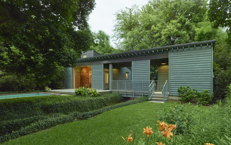 The owners had three goals for this project and imagined that it would take three buildings to provide a pool house that expands the usability of their existing pool, including a shaded sitting area, kitchenette, shower and bathroom; to provide privacy and enclosure from the rear neighbors; to build a bridge across the drainage “creek” and unite the adjacent lot and garden; to provide a garden and storage shed to support their gardening passion.