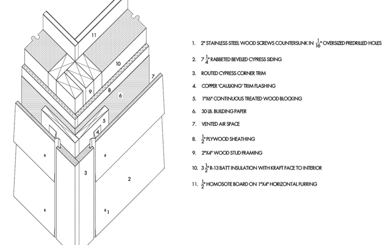 The pool house is a wood frame structure with a rain screen cypress skin. All the joints and flashing are copper.