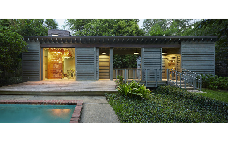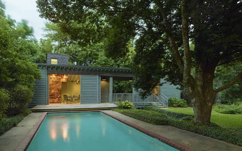 The architect’s solution was to follow the historic tradition of neighborhood back buildings but instead of three building projects, they united all three programs into one building. The solution includes a pool house, bridge, and garden shed linked to accomplish the owner goals. In order to transform the pool house into an open sitting area opposite the pool, large barn doors open and fully and move over the creek and cover the bridge adding privacy to the back yard when the owners are using the pool and pool house. The copper clad shower structure anchors the composition and provides a “hot figure”. The copper is visually hotter than the summer air, psychologically increasing the contrast and sensitively for everything cool; the greenery of the lush garden, the pool water, and the shady sitting area.