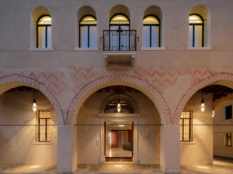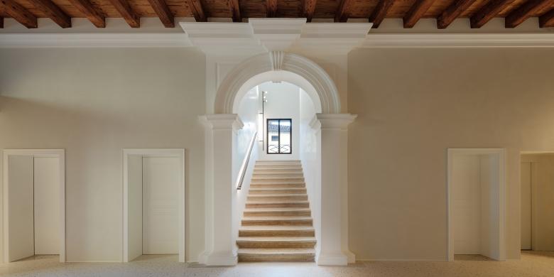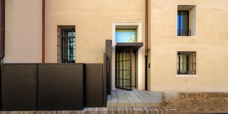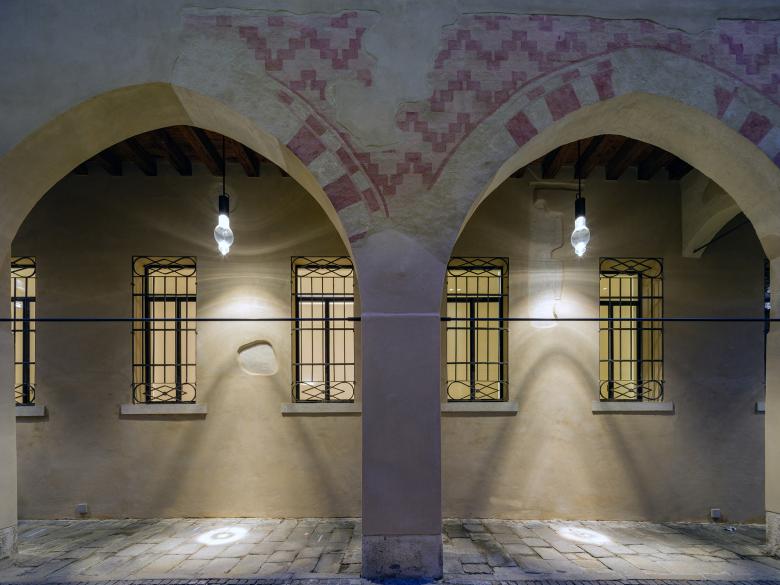 The first step of the project fulfilled the need to remove those inconsistent integrations with the history of the building, to consolidate the original structure, to give it a clearer reading and to rediscover some ancient frescoes on the main facade, according to the spirit of Treviso, also called "Urbs picta" thanks to its many frescoed buildings.