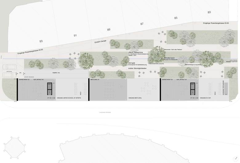 Diese Haltung soll auch in der Fassaden- und Umgebungsgestaltung seinen Ausdruck finden. Das Hauptgebäude als schwebender Körper über einem transparent gestalteten Erdgeschoss soll Leichtigkeit und Prägnanz vermitteln. Die angedachte grosszügige Parkgestaltung zwischen den Gebäudezeilen unterstützt diese Grosszügigkeit.