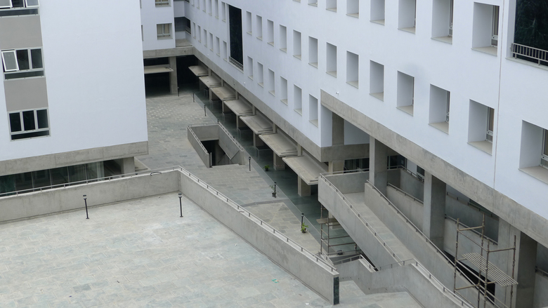 The generic strip is folded to fit the irregular site, leaving statutory setbacks on the periphery. The resultant central open space forms a strong focal point for the student community. A grand staircase extends the semi-public upper plaza onto the hyper public lower plaza, and further down to the parking level.