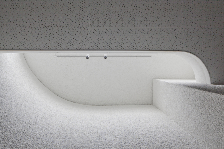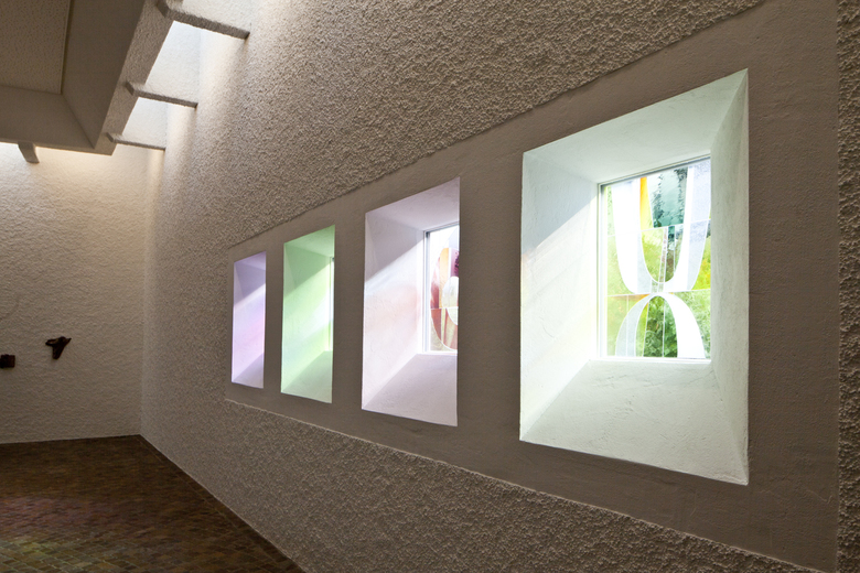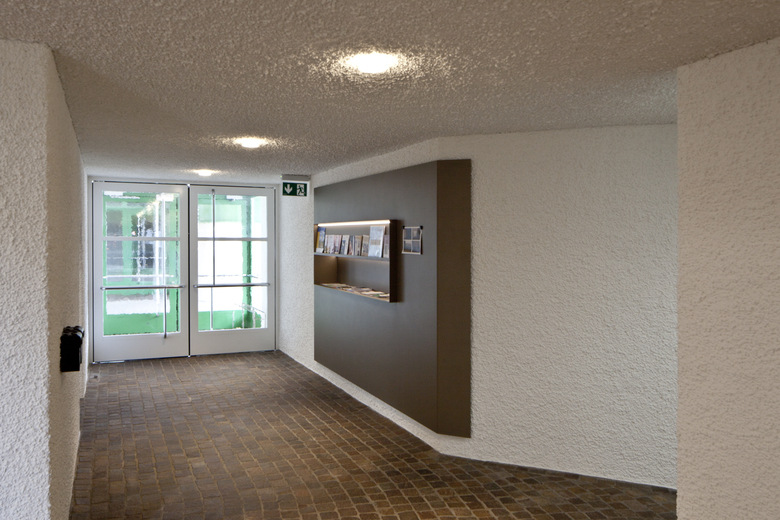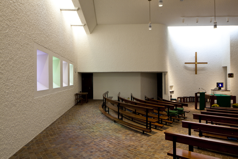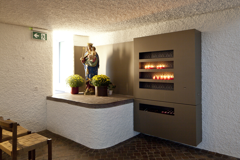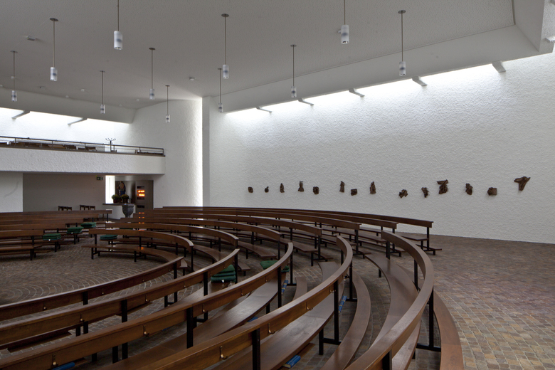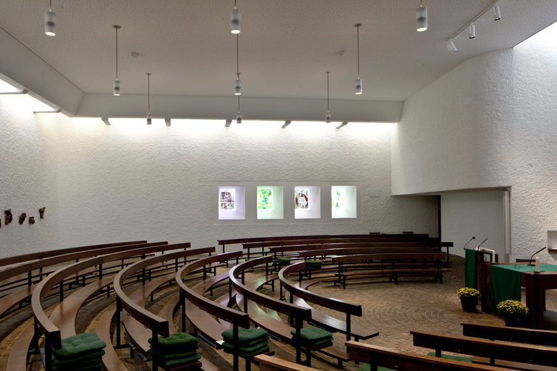 Die bestehende Wandnische im Eingangsbereich wird mit einem skulpturalen Wandelement aus Stahl vergrößert und bietet dadurch eine optimale Literatur+/ Prospektablage. Die russreduzierende Kerzenschmelze ist in dieser Nischenverkleidung integriert und bildet so einen stimmungsvollen Eckabschluss. Die Decke im Kirchenraum wird neu mit einer abgehängten Akustikdecke ausgekleidet. Die Mineralwolldämmung im Konstruktionsbereich der Decke ermöglicht eine einfache Elektroinstallation der neuen Pendel und Deckenleuchten und dient zugleich als energetische Optimierung des Flachdachs. Die Beleuchtungskörper des kompletten Kirchenraums inkl. Empore, Tages+/ Oblichtbänder werde mit LED-Leuchten ersetzt. Dieser Mix aus dekorativen Pendelleuchten, technischen Einbauspots und LED-Lichtbändern ermöglichen eine energieeffiziente und stimmungsvolle Ausleuchtung der Räumlichkeiten. Die Innenwände und Deckenteile des Kirchenraums werden gereinigt und neu gestrichen.