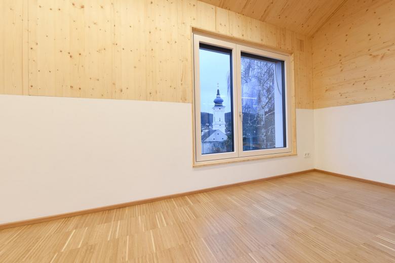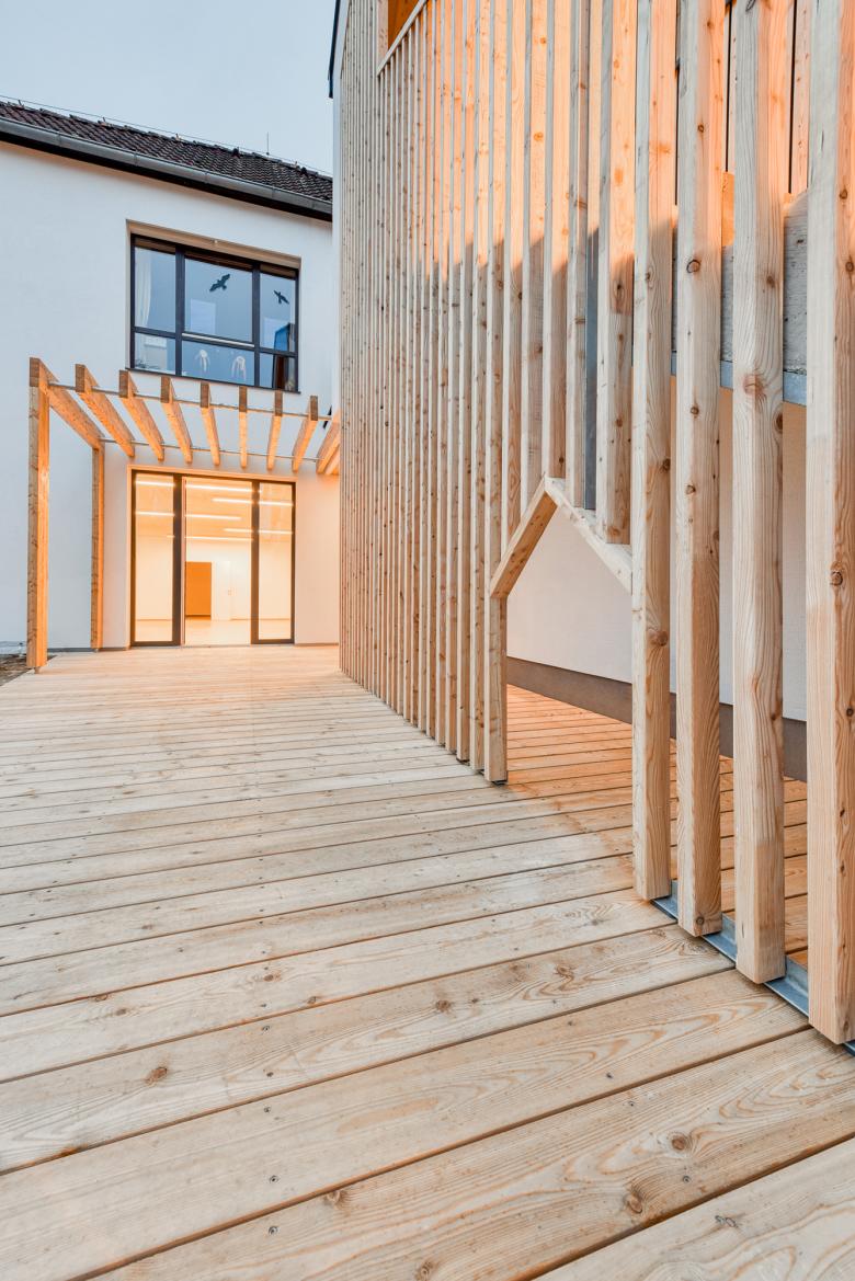 Die Gestaltung des Baukörpers entwickelt in jede Himmelsrichtung eine spezifische Außen- Innenbeziehung: Loggia, Gartenzugang und Sichtverbindung zum Stift Göttweig für die Kindergruppe, überdachte Terrasse und Rundumblick von Pfarrkirche bis zum Stift für Aufenthaltsraum, Multifunktionsraum und Musikschul-Foyer; der Verbindungs-Holzpavillon öffnet sich mit großzügigen Terrassen zum zentralen Kindergartenplatz.