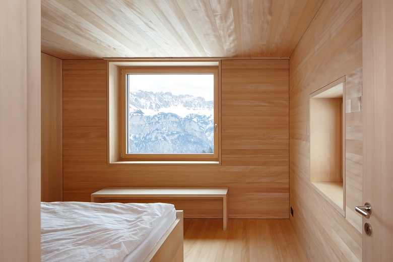 Die beiden über Eck geführten Panoramafenster im Hauptraum richten sich zu den sieben Bergspitzen der Churfirstenkette im Norden und zu den sieben Gipfeln der Alvierkette im Nordosten. Die inszenierten Aussichten auf die Wolkenbilder und Felsformationen zwischen Firnschnee und Waldgrenze im Morgen- und Abendlicht verleihen dem Haus — über seine innere Abwicklung hinaus — eine landschaftliche Dramatik. Die flächigen Auskleidungen des Holzbaus überhöhen diesen Effekt. Durch den langsamen Wuchs im Gebirge und durch die Auswahl bei der Verarbeitung ist das Weisstannenholz beinahe astlochfrei. Der vorgefertigte Ständerbau wurde innen an allen Oberflächen und Einbauten mit fein gehobeltem Weisstannentäfer ausgekleidet, dass es den bewaldeten und zerklüfteten Hängen der Voralpen im Innern des hölzernen Kubus eine präzis komponierte Innenwelt erstaunlicher Schlichtheit gegenüberstellt.