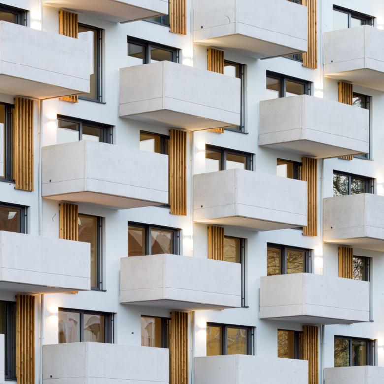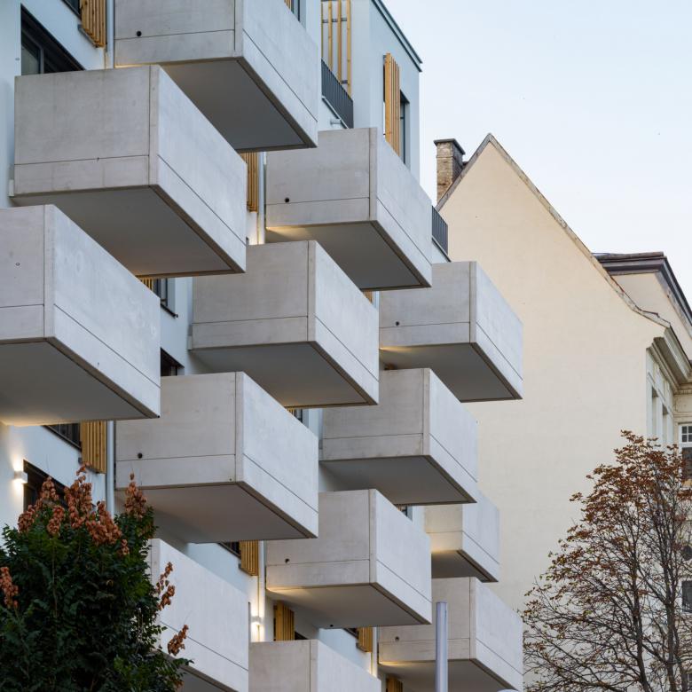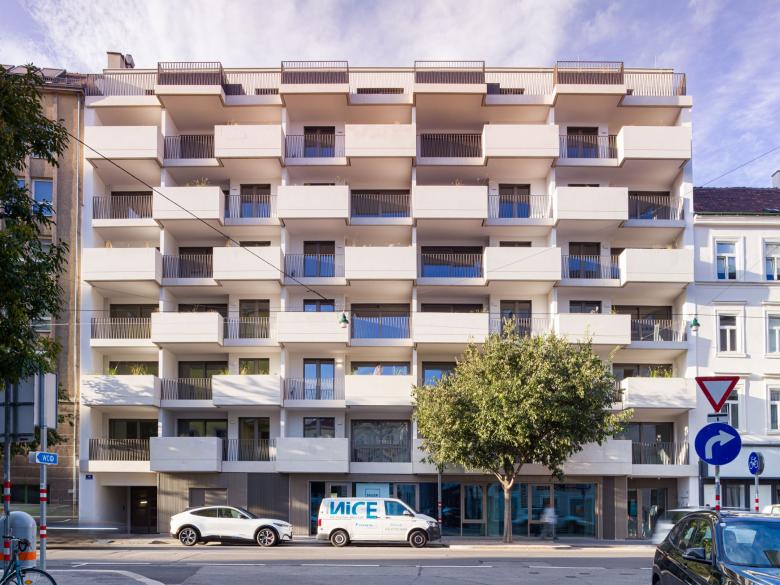Die hellen, lichtdurchfluteten Wohnungen sind zur Schönbrunner Straße als auch zur Wienzeile orientiert und bestechen durch ihre großzügigen Verglasungen. Alle der 60 Wohnungen verfügen über Freiflächen in Form von Balkonen oder Loggien. Durch deren Versetzung gibt es eine weite und offene Situation im Außenraum. Jede Freifläche wird mit Pflanztrögen bestückt, so dass die MieterInnen ihren eigenen Grünbezug haben können.