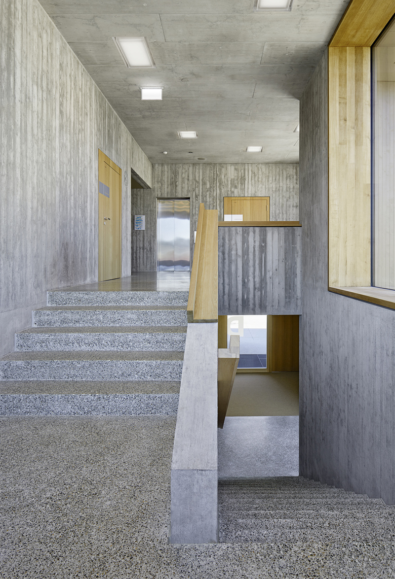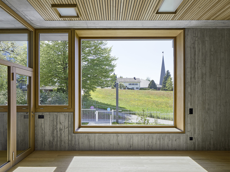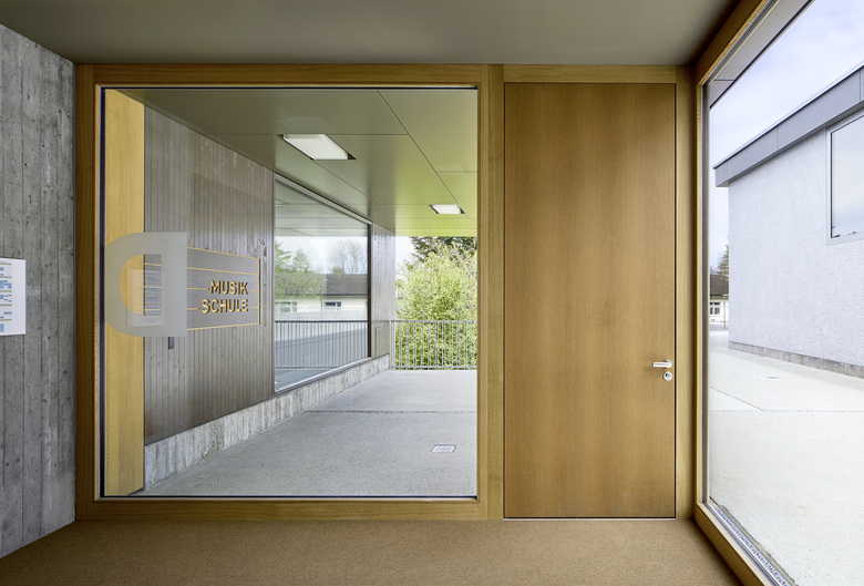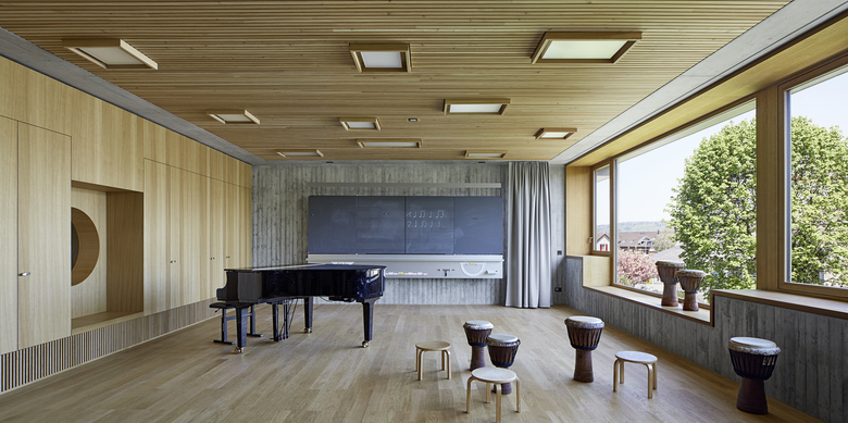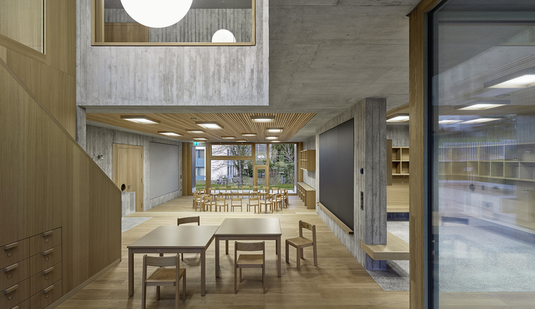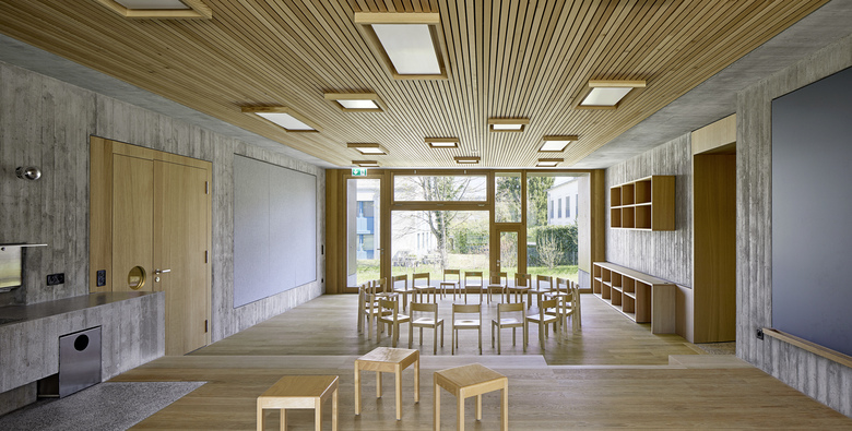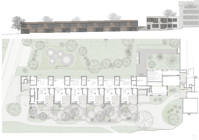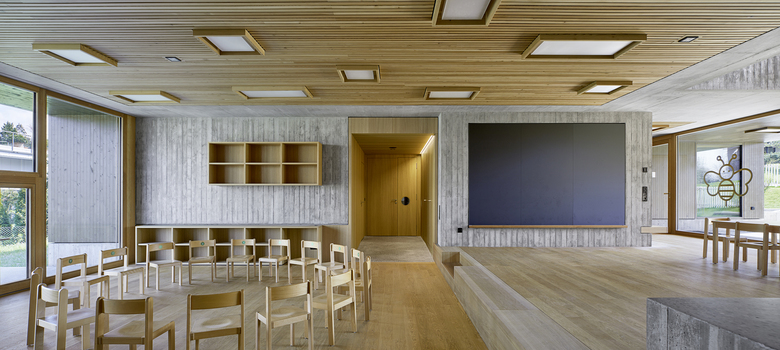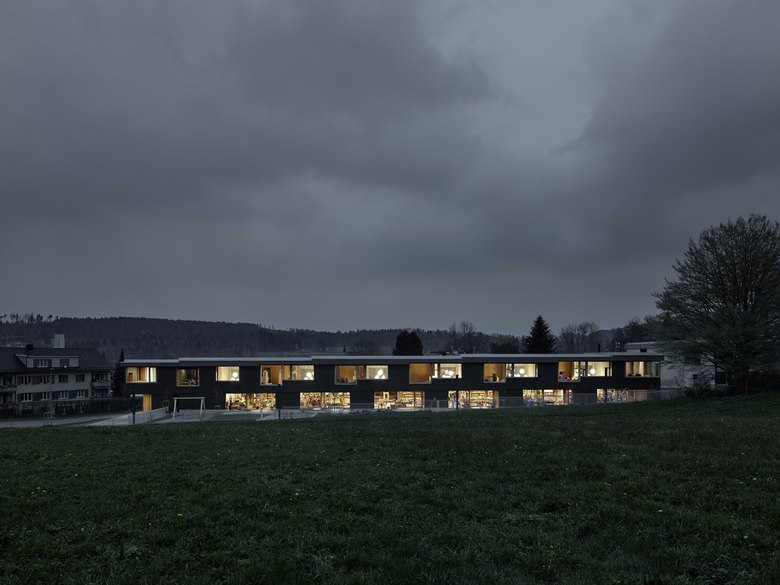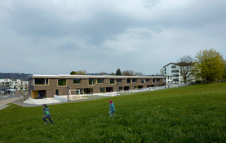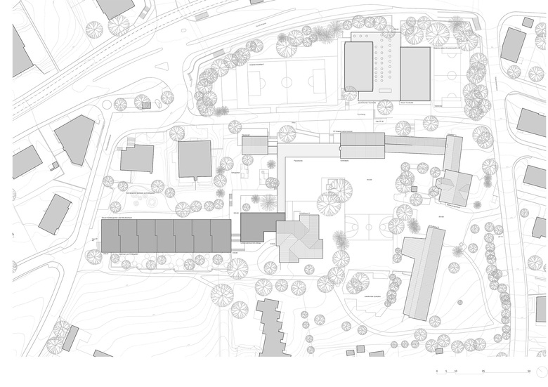 Die räumliche und architektonische Fassung der bestehenden Schulanlage ist durch das Wechselspiel von Autonomie der einzelnen Gebäudekörper und deren losen Partizipation an der Gesamtanlage geprägt. Unterschiedliche Etappen repräsentieren jeweils die formale Sprache Ihrer Zeit. Die städtebauliche Collage des Bestandes wird um weitere Bausteine und mit kleinen räumlichen Veränderungen des Bestandes, ohne die vorhandene Anlage zu überformen ergänzt. Die Ergänzung des Bildungszentrums umfasst als Schwerpunkt einen Kindergarten- und Musikschultrakt, sowie einen erweiterten Lehrerbereich, eine neue Turnhalle und die Umnutzung einer Turnhalle in die Schulaula. Der Neubau des Kindergartens- und Musikschulgebäudes nutzt das Spannungsfeld der pädagogischen Anforderungen als Ausgangspunkt für die Entwicklung einer spezifischen Typologie für den Ort: Auf dem Niveau des oberen Pausenplatzes wird an einer linearen inneren Erschliessung die nutzungsneutralen, durch unterschiedliche Altersstufen genutzten Räume (Musikschule, Kindergartengruppenraum, Mehrzweckraum, nutzbare Räume für Primarschule) angeordnet. Im Sockelgeschoss werden die direkt durch den Aussenraum erschlossenen Kindergarteneinheiten aufgereiht (Adressbildung). Die Kindergarteneinheit wird räumlich geprägt durch einen als „Haus im Haus“ konzipierten kontinuierlichen Hauptraum. Die Turnhallenerweiterung sowie der Umbau - und Ergänzungsbereich der Schulaula bildet die architektonische Form und die konstruktive Logik des Bestandes als Basis für eine zeitgenössische Interpretation und der funktionalen Anpassung. Die Turnhallenerweiterung ermöglicht eine grösst mögliche Polyvalenz in der Bespielung der Halle, eine synergetische Nutzung mit der bestehenden Sporthalle, sowie eine spätere Erweiterung zu einer Doppelhalle.