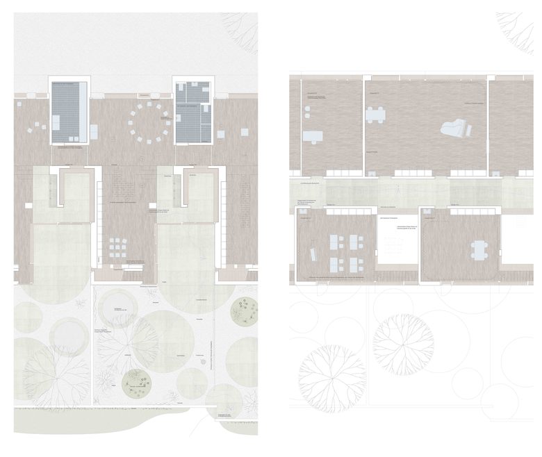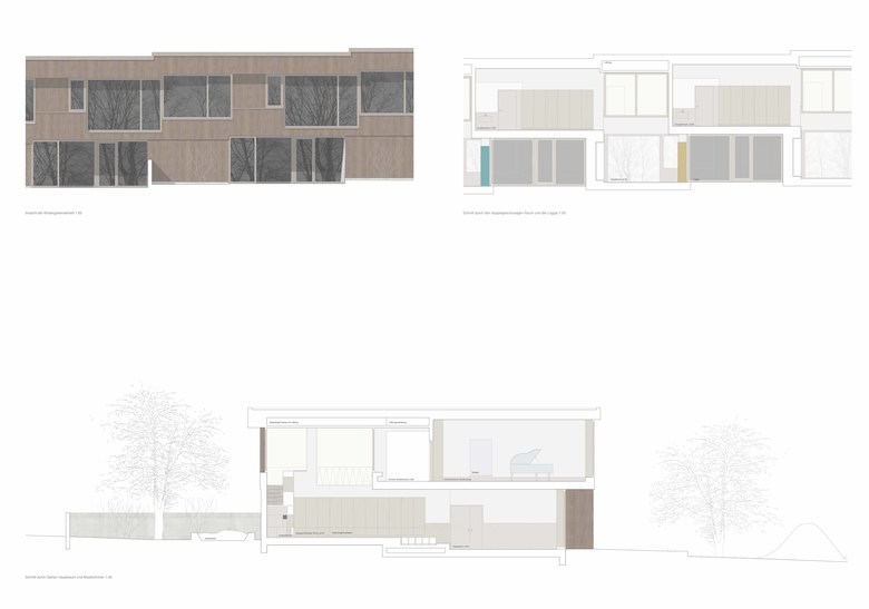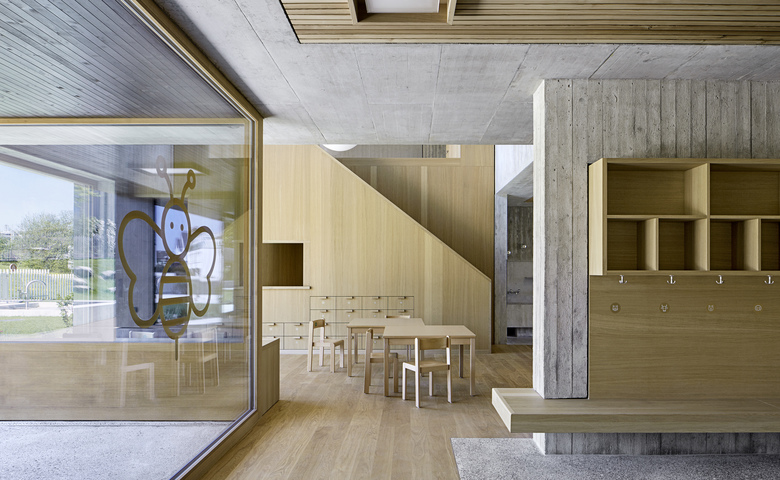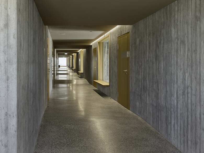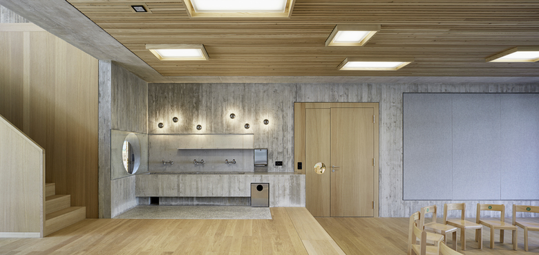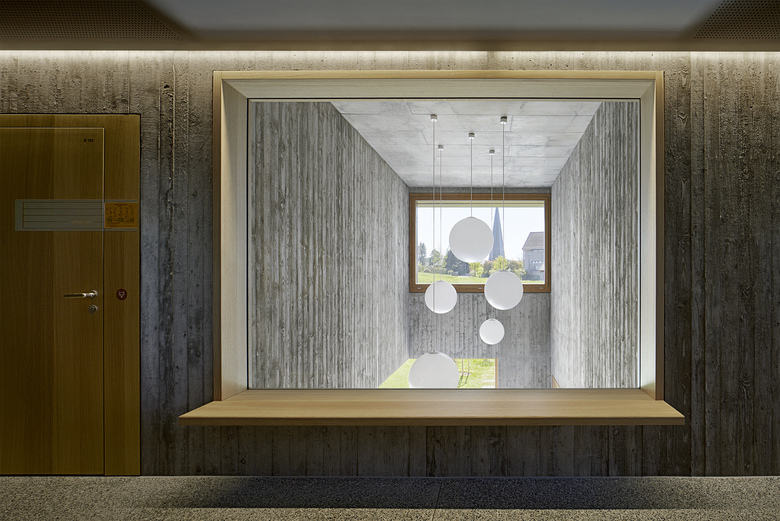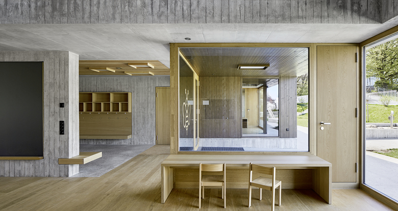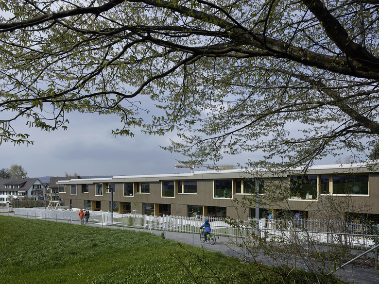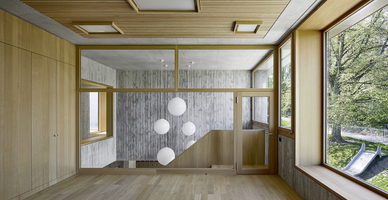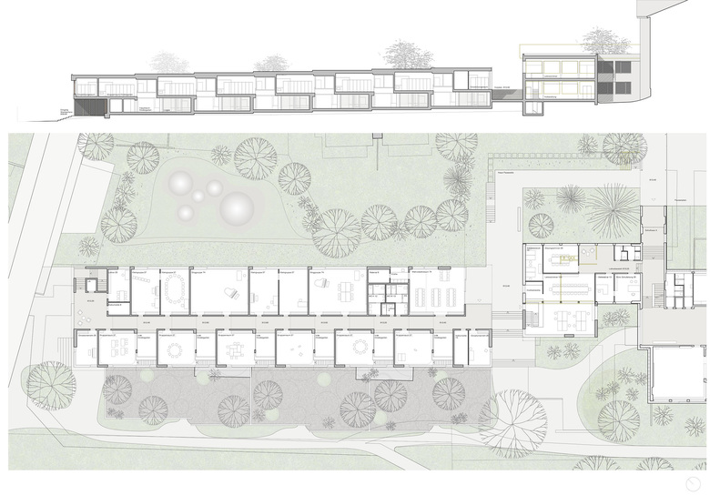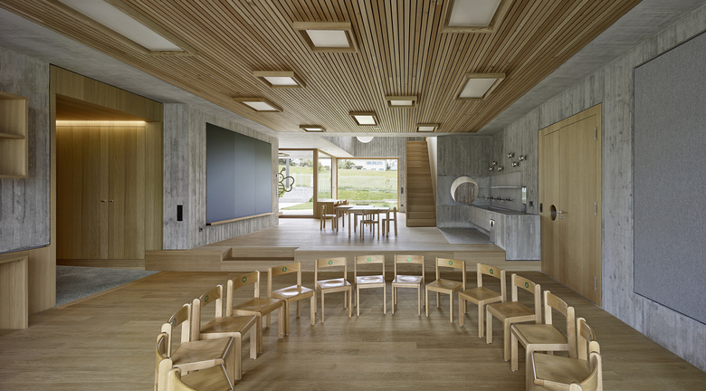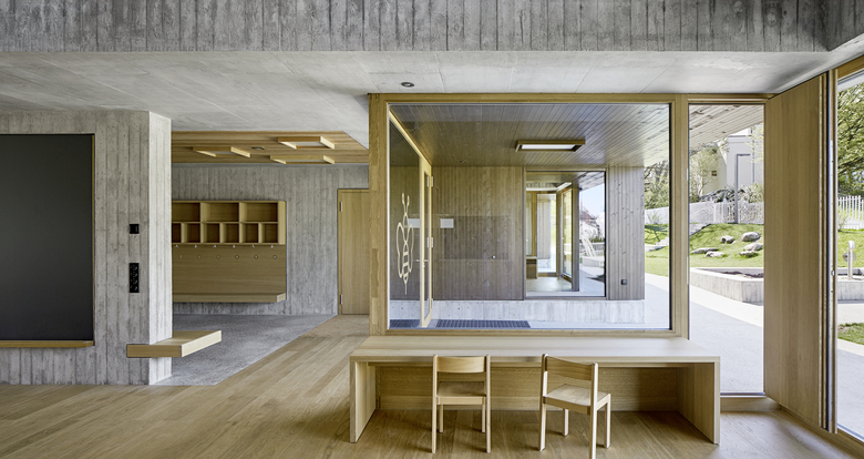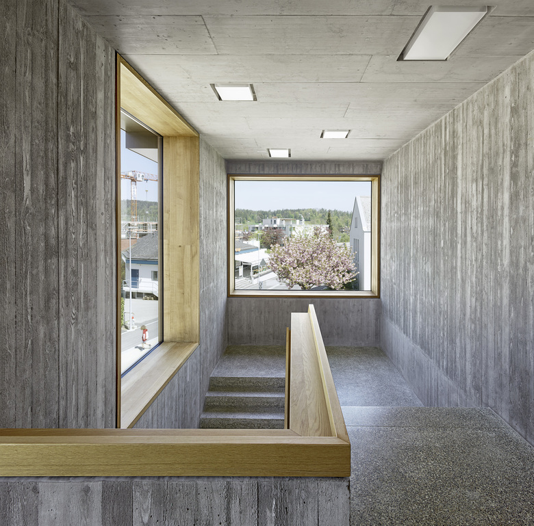 Die räumliche und architektonische Fassung der bestehenden Schulanlage ist durch das Wechselspiel von Autonomie der einzelnen Gebäudekörper und deren losen Partizipation an der Gesamtanlage geprägt. Unterschiedliche Etappen repräsentieren jeweils die formale Sprache Ihrer Zeit. Die städtebauliche Collage des Bestandes wird um weitere Bausteine und mit kleinen räumlichen Veränderungen des Bestandes, ohne die vorhandene Anlage zu überformen ergänzt. Die Ergänzung des Bildungszentrums umfasst als Schwerpunkt einen Kindergarten- und Musikschultrakt, sowie einen erweiterten Lehrerbereich, eine neue Turnhalle und die Umnutzung einer Turnhalle in die Schulaula. Der Neubau des Kindergartens- und Musikschulgebäudes nutzt das Spannungsfeld der pädagogischen Anforderungen als Ausgangspunkt für die Entwicklung einer spezifischen Typologie für den Ort: Auf dem Niveau des oberen Pausenplatzes wird an einer linearen inneren Erschliessung die nutzungsneutralen, durch unterschiedliche Altersstufen genutzten Räume (Musikschule, Kindergartengruppenraum, Mehrzweckraum, nutzbare Räume für Primarschule) angeordnet. Im Sockelgeschoss werden die direkt durch den Aussenraum erschlossenen Kindergarteneinheiten aufgereiht (Adressbildung). Die Kindergarteneinheit wird räumlich geprägt durch einen als „Haus im Haus“ konzipierten kontinuierlichen Hauptraum. Die Turnhallenerweiterung sowie der Umbau - und Ergänzungsbereich der Schulaula bildet die architektonische Form und die konstruktive Logik des Bestandes als Basis für eine zeitgenössische Interpretation und der funktionalen Anpassung. Die Turnhallenerweiterung ermöglicht eine grösst mögliche Polyvalenz in der Bespielung der Halle, eine synergetische Nutzung mit der bestehenden Sporthalle, sowie eine spätere Erweiterung zu einer Doppelhalle.