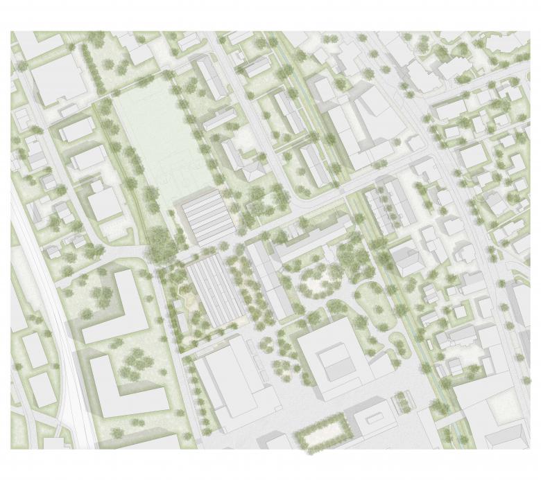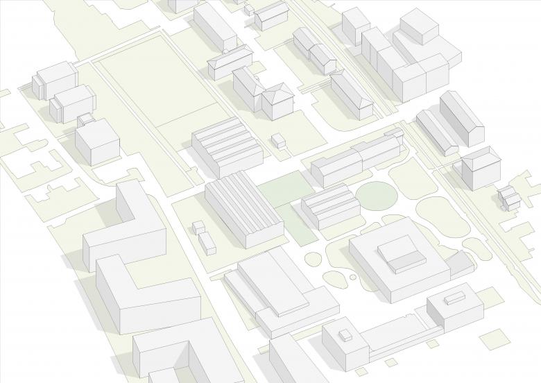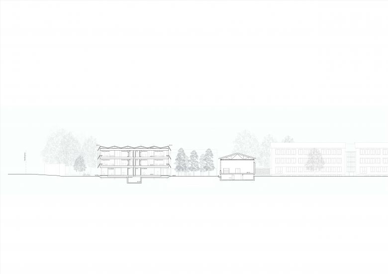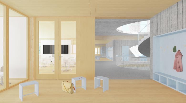 Das neue Gebäude bildet die solide städtebauliche Basis für eine flexible mittel- bis langfristige Erweiterungsstrategie des Schulstandortes Allmend in mehreren Etappen. Als Visavis zum bestehenden Turnhallentrakt mit dem prägenden gedeckten Durchgang in Ost-Westrichtung, setzt sich das Gebäude entlang der Nordsüdachse sanft an den Ort. Mit den offenen Lauben entlang den Längsseiten im Erdgeschoss verwebt sich das neue Schulhaus zu den für die Primarschulkinder wichtigen Aussenräumen. Nach Osten grenzt an die Zugangslaube der zentrale Schulhof und nach Westen verknüpft die privatere Gartenlaube das Haus mit dem Schulgarten. Die Verbin dungachse in Nord-Süd Richtung bleibt für die Öffentlichkeit bestehen, erscheint aber im Bereich des Schulhofes als halbprivater Ort für die Schulkinder. Die Lernräume im neuen Schulgebäude werden als flexible und wandelbare Raumgefässe entwickelt. Die Konzentration der Unterrichtsräume auf lediglich zwei Obergeschosse ermöglicht eine optimale alterspezifische „Nähe“ zu den Aussenräumen für die Kinder, sowie ein hohes Mass an möglichen Raumverknüpfungen und Variabilität der Grösse der pädagogischen Teams für den Unterricht. Die Basiseinheit bilden ein Cluster von zwei Klassen mit einem gemeinsamen möblierbaren Garderobenraum und zwei aneinandergrenzenden Gruppenräumen, welche für den Unterricht zusammen mit der Garderobe eine eigene offene Lernzone bilden kann. Die Unterrichtsräume bilden kommunikative „Räume als dritter Pädagoge“ für die Schulgemeinschaft. Die Wandelbarkeit der Räume ermöglicht altersgerechte Unterrichtsformen vom klassischen Frontalunterricht in der Kerngruppe, über individuelles Lernen mit der Integration des spezifischen Förderunterrichtes im Atelierbetrieb bis zum klassenübergreifenden und altersdurchmischten Arbeiten in der offenen Lernlandschaft (Open-Space). Das Tragstrukturskelett, die Vertikalerschliessung, die Gebäudehülle und die dienende Infrastruktur (Haustechnik, Nassbereiche) bilden den „Rahmen“ in welchem sich der Unterrichtsraum den stetig wandelnden Anforderungen an die Schule, ohne wesentliche bauliche Eingriffe, verändern lässt.