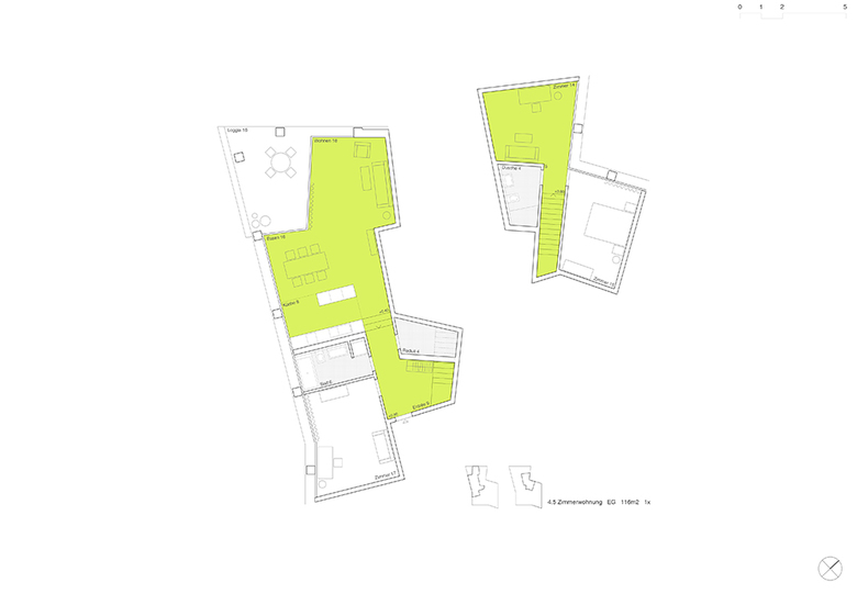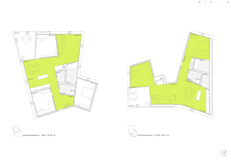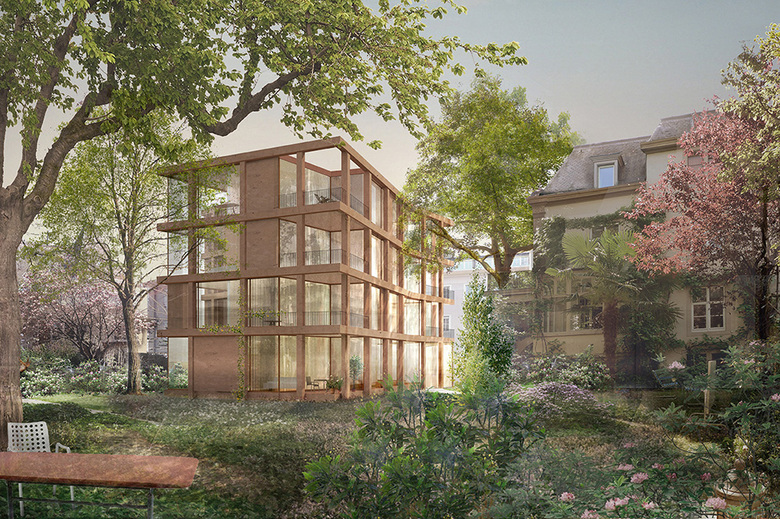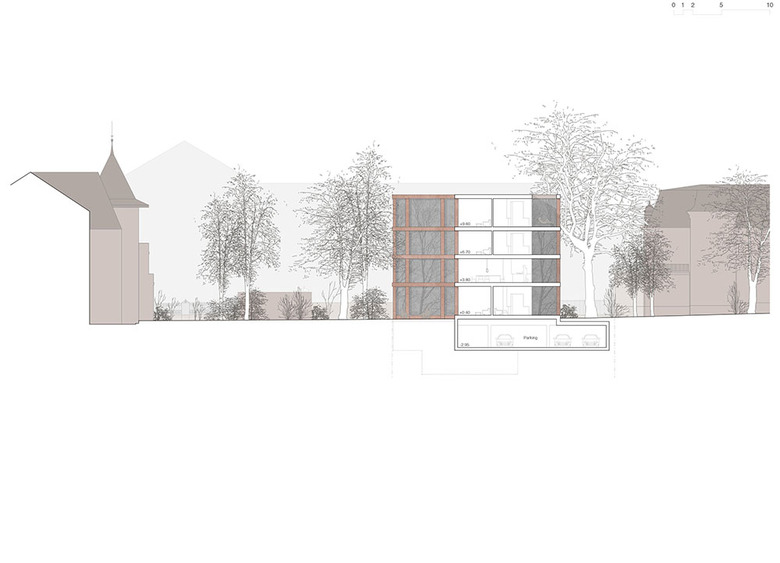 Ziel des Projektes ist die historisch wertvolle bauliche Substanz des Kontextes sowie die spezifische räumliche Qualität des identitätsstiftenden Grünraums sowie deren Wahrnehmung im öffentlichen Strassenraum zu erhalten. Im Unterschied zu den angrenzenden Gebäuden, weicht der Neubau von der Strassenbaulinie zurück. Dadurch wird das Haus nicht zur Trennung von Strassenraum mit Vorgarten und Hofraum als Garten, sondern als Volumen in den idyllischen zur Strasse offenen Hofgrünraum gesetzt. Die Materialität sowie die Gliederung der horizontalen Gesimse, Risalite sowie die Hierarchie der horizontalen und vertikalen Gliederung der Bestandesgebäude bilden Themen der Neubaufassade. Die sandsteinfarbene Betonstruktur der Fassade und deren tektonische Gliederung interpretiert Themen der bestehenden Bebauung in zeitgenössischer Form und oszilliert zwischen der physischen ruhenden Schwere der Nachbargebäude und der ephemeren Transparenz des baumbestandenen Grünraumes. Die Verformung der Grundrisskontur ermöglicht die situative Volumengliederung und ein respektvolles Reagieren auf den Bestand (Gebäude und Baum) und ermöglicht eine räumliche Kontinuität und Weite des umgebenden Aussenraumes. Sie bildet gleichzeitig die Basis der vielseitigen Ausrichtung der Wohnungen.