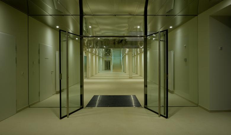 Dazu gehören auch die Erschließung, die per Auto in eine neue Tiefgarage, Kollektorgänge zwischen den 3 Häusern und Liften erfolgt. – oder per pedes durch eine tiefe Lobby aus dem Altbestand, die mittels Lichtschacht aufgehellt wurde.