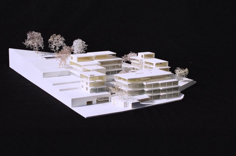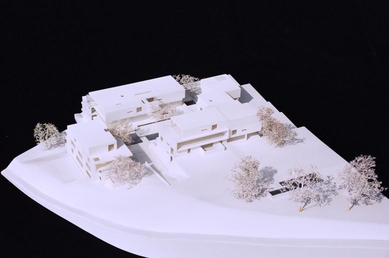 Sichtbetonkuben mit corbusianischen Bandfenstern und relativ