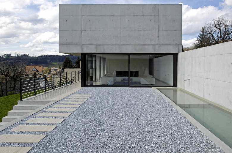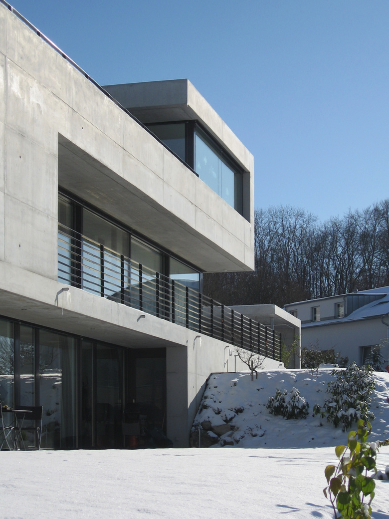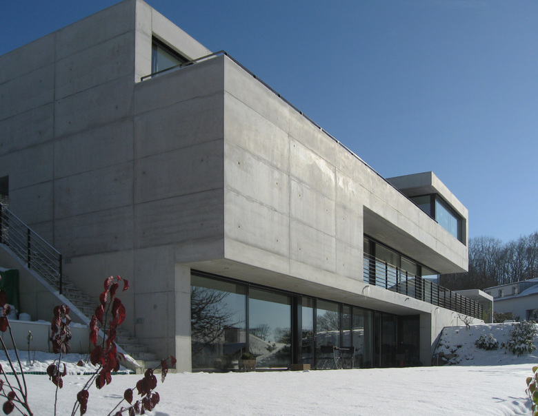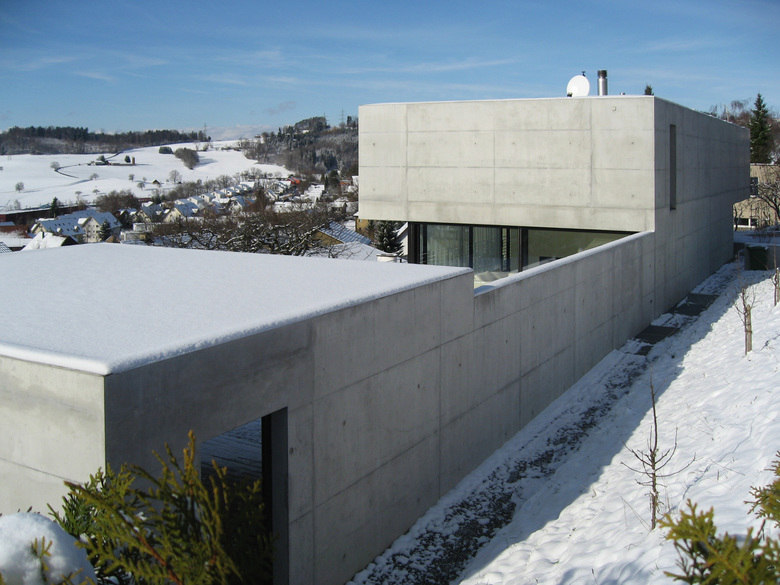 Der schlichte Betonkubus besitzt präzise Kanten. Exakt austariert sitzt er mit seinen Aussenräumen in der schrägen Topografie des ehemaligen Rebberges. Talseitig öffnen sich die bewohnten Räume skulpturartig in benutzbaren Ausschnitten, Vertiefungen und Höfen.