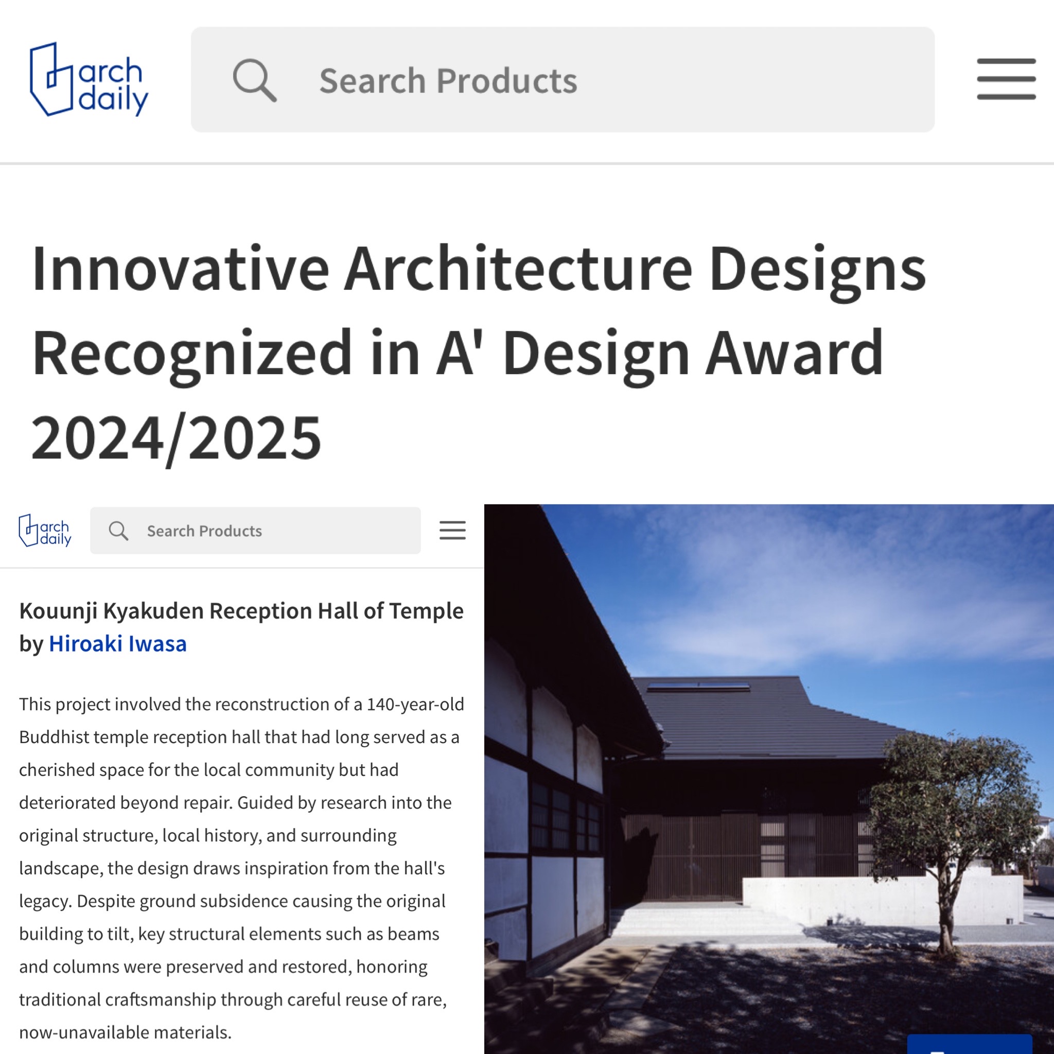 "Kouunji Kyakuden" was featured in the "20 Outstanding Architecture Among the A'Design & Award 2025 Winners" special feature in ArchEyes.com, a web magazine specializing in architectural design that selects timeless works.