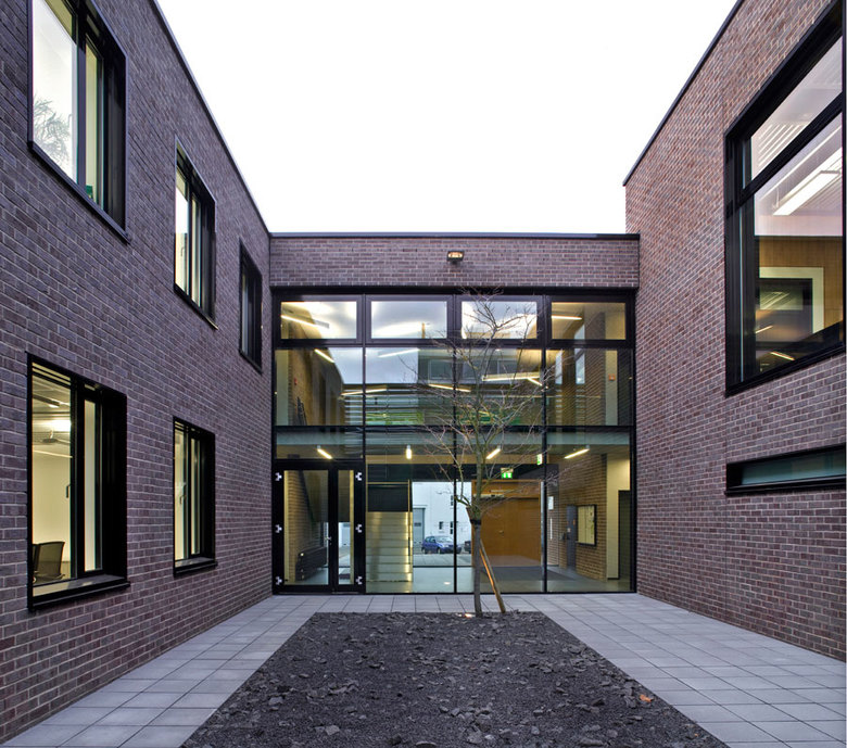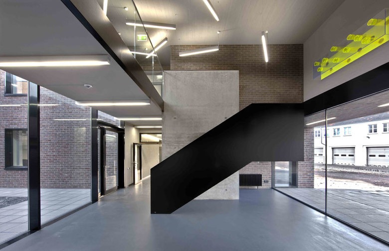 Auszug Preisgerichtsbeurteilung: Die einfache Kubatur des Gebäudes wird an der Leitzentrale erhöht und damit richtig ausgeformt. Die beiden nach innen wirkenden Raumelemente Innenhof und Dachterrasse geben dem inneren Raumgefüge eine wohltuende Gliederung. Insbesondere der Eingangsbereich als auch der Raum für die Einsatzsachbearbeitung profitieren hervorragend von derartigen Raumelementen. Die Funktionalität des Gebäudes ist herausragend.