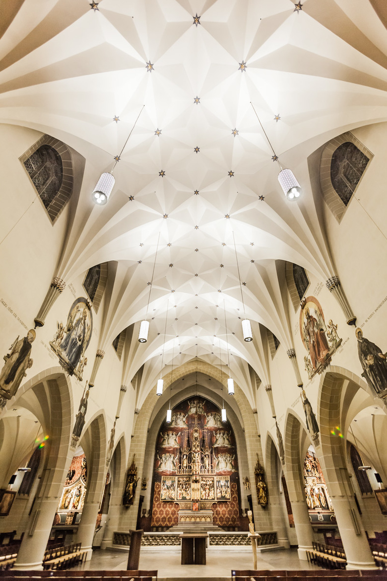 Der Hochaltar, den gotischen Flügelaltaren nachgebildet, erhält durch gerichtetes Licht seine Brillanz wieder und die Blattgoldflächen reflektieren Goldtöne in den Raum. Ebenso werden die sieben Engelsbilder an der Wand mit Licht akzentuiert.