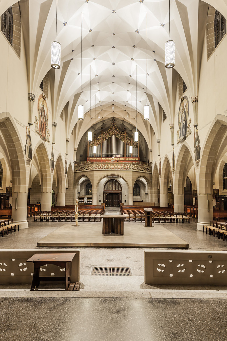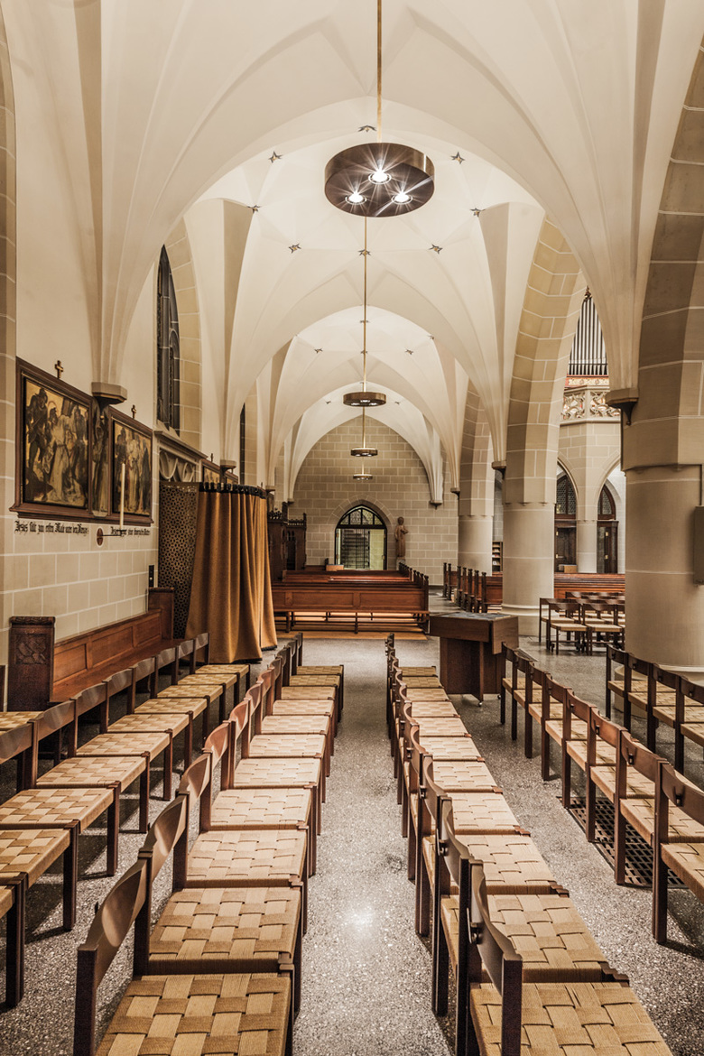 Die komplette Erneuerung der Beleuchtung unterstützt die wiedergewonnene Helligkeit der Oberflächen. Im Hauptschiff sind die ehemaligen zylindrischen Blechleuchten durch grosse Leuchten mit einem brünierten Messingschirm ersetzt worden. Getrennt schaltbare LED-Lichtquellen erzeugen sowohl ein Licht gegen das aussergewöhnlich gestaltete Rabitzgewölbe, seitlich durch den Messingfilter an die Wände sowie direkt nach unten mit kräftigen Downlights.