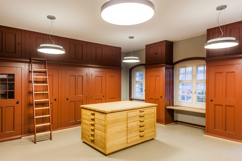 Die Sakristei bringen flächige Pendelleuchten viel Licht in den Raum.