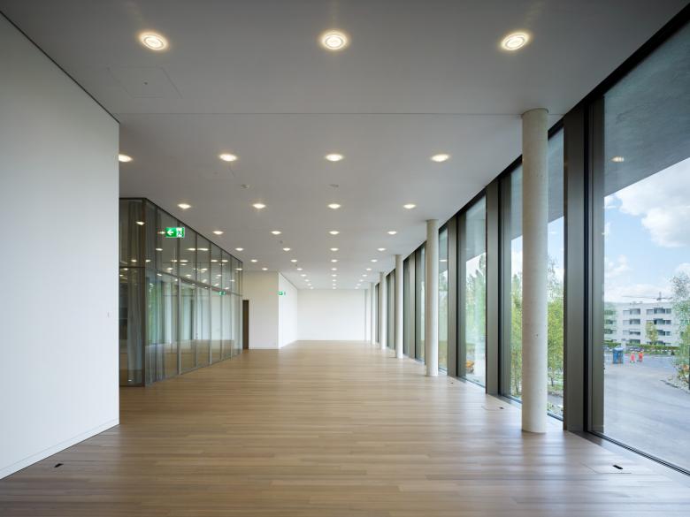 Mit dem schlichten Beleuchtungskonzept wird die transparente Erscheinung und zurückhaltende Materialisierung sämtlicher Räumlichkeiten unterstrichen. Die transparente, gläserne Leuchte, die sich in ihrer Anordnung in die Struktur der Gebäude einfügt, wird Teil des Raumes und ist doch als eigenständiges Objekt wahrnehmbar. Für die architektonische Grundbeleuchtung sind alle Räume fassadenseitig gleichwertig behandelt.