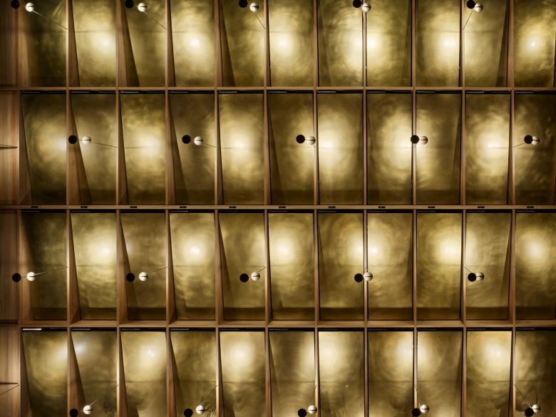 Um dem grossen Auditorium einen zusätzlichen festlichen Charakter verleihen zu können, werden die hochwertigen Bronzepaneele der Decke mittels einer Stableuchte angeleuchtet, an der je ein bis zwei LED-Bronzeschalen befestigt sind.