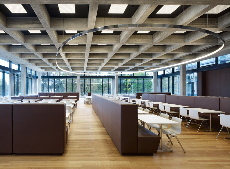 Im zweigeschossigen Bereich der Cafeteria sollen die Deckenleuchten typgleich wie im Speisesaal zum Einsatz kommen. Damit ist eine einheitliche Erscheinung gewährleistet. Die freistehende Kaffeebar erhält Licht über die Deckenleuchten. Die freistehenden Verkaufskorpusse sind über Deckeneinbauleuchten in der abgehängten Decke kräftig angestrahlt. In der Galerie sind Leuchten in der aus Lamellen ausgebildeten Decke verteilt und erzeugen eine angenehme Lichtstimmung. Helle, niedrige Sitzmöbel und ein heller Bodenbelag reflektieren das Licht gut in den Raum. Zudem sind in den Bereichen zwischen den breiten Stützen fest montierte Lichtstelen vorgesehen, welche diese Zonen betonen.