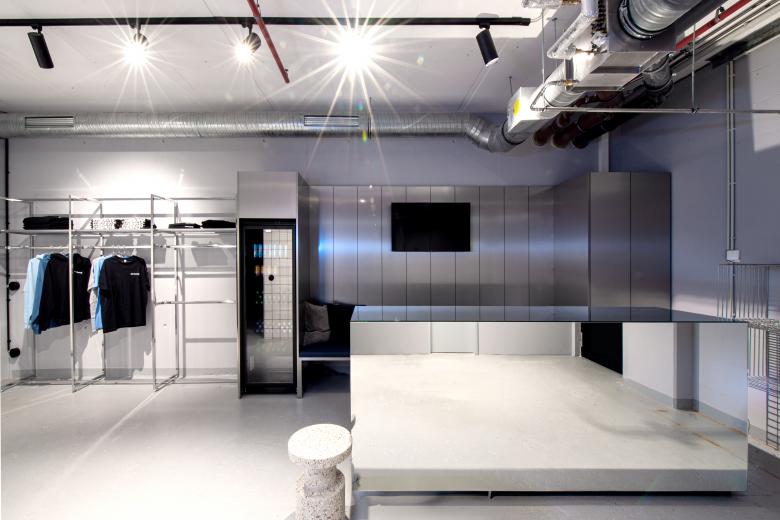 Der Eingangs- und Wartebereich wird durch den verspiegelten Tresen, Wandverkleidungen und Stauraum mit Edelstahloberfläche optisch vergrößert und vermittelt durch die besondere Materialwahl ein modernes und cooles Ambiente. Merchandising-Produkte wie T-Shirts und Pullover werden in den Ausstellungsregalen aus Metall zum Blickfang.