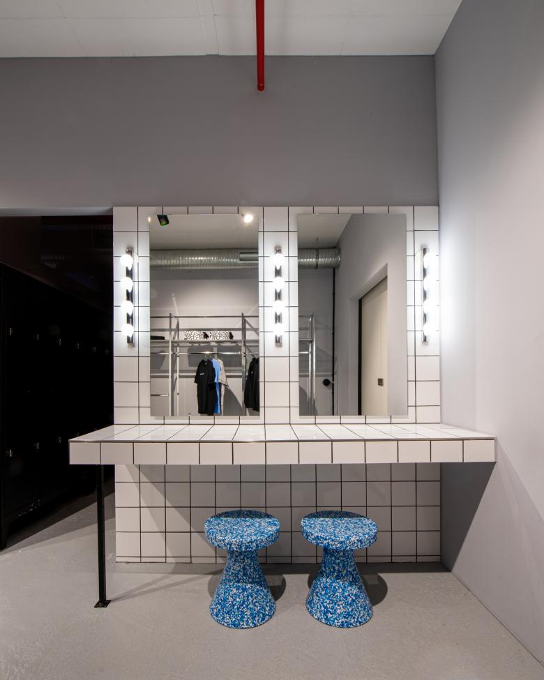 Im Umkleidebereich treffen stereotype Wandleuchten auf architektonisch anmutende Fließen und verspielte Hocker aus Recyclingmaterial. Die Farbe Kobaltblau ist Blickfang und setzt Akzente in den Räumlichkeiten. So ist die kleine Toilette monochrom gestaltet und leuchtet in dem kräftigen Farbton.