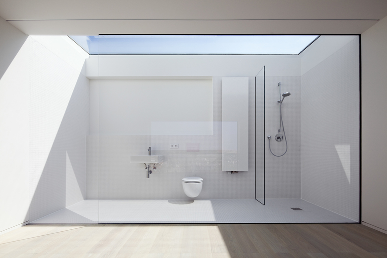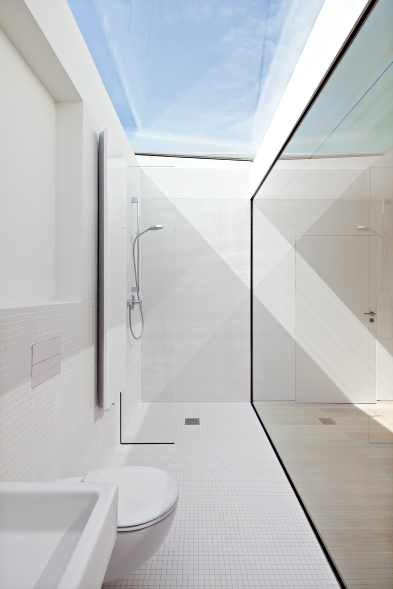 Die durchdachte Planung der durchgehenden Glasscheibe, ohne sichtbaren Rahmen, gibt einem das Gefühl unter freiem Himmel zu duschen. Der Lichteinfall erzeugt je nach Tagesstunde unterschiedliche Schattenspiele im Raum.