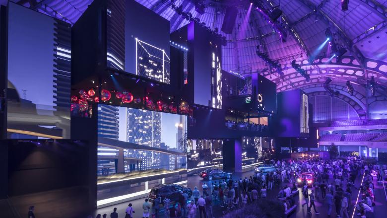 Die Ausstellungsarchitektur von jangled nerves zieht einen Gebäuderiegel quer in die Festhalle. Er beherbergt auf über 5000 m2 eine hochmoderne Ausstellung, die »Experience«. Die kreative Idee dahinter war, mit dem altehrwürdigen Gebäude anders umzugehen, als in den Jahren zuvor. Das schafft mehr Bezug zur Halle und zur Stadt und vermittelt die zukünftige Beziehung Mensch-Automobil möglichst authentisch.