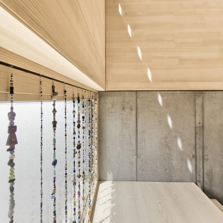 Straßenseitig präsentieren sich das Erdgeschoss aus einzelnen Betonblöcken und der Holzbau darüber als zwei klar getrennte Volumen. Die ebenerdigen Blöcke sind so zueinander versetzt, dass straßenseitig ein eingeschnittener Eingangsbereich und gartenseitig eine eingeschnittene Loggia entstehen. Dazwischen spannt sich ein großzügiger aber differenzierter Wohnraum auf. Richtung Süden öffnet sich der Baukörper immer mehr und orientiert sich schließlich komplett in den Garten.